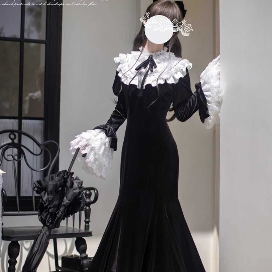 ゴスロリ地雷系 ロリィタ フィッシュテールドレス ベルベット エレガント 袖コンシャス 豪華 胡桃木
