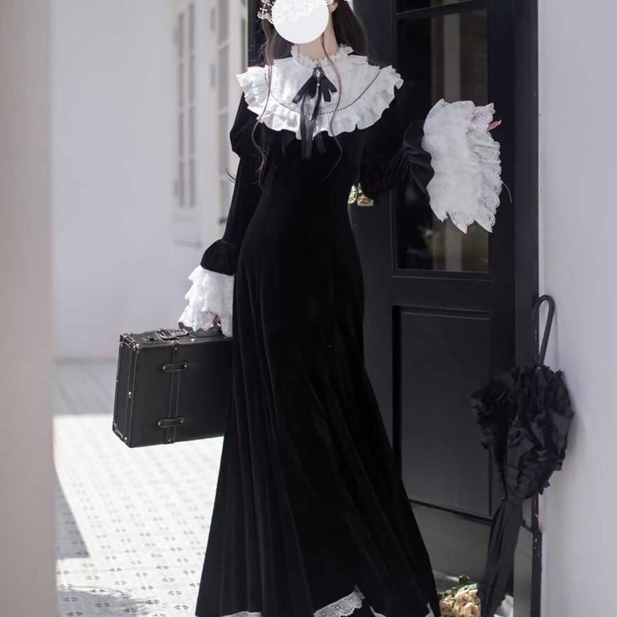 高級感のある黒のベルベット生地に、オフホワイトの繊細なレースやフリルが襟元、袖、裾にあしらわれた、クラシカルロリータのワンピースです。