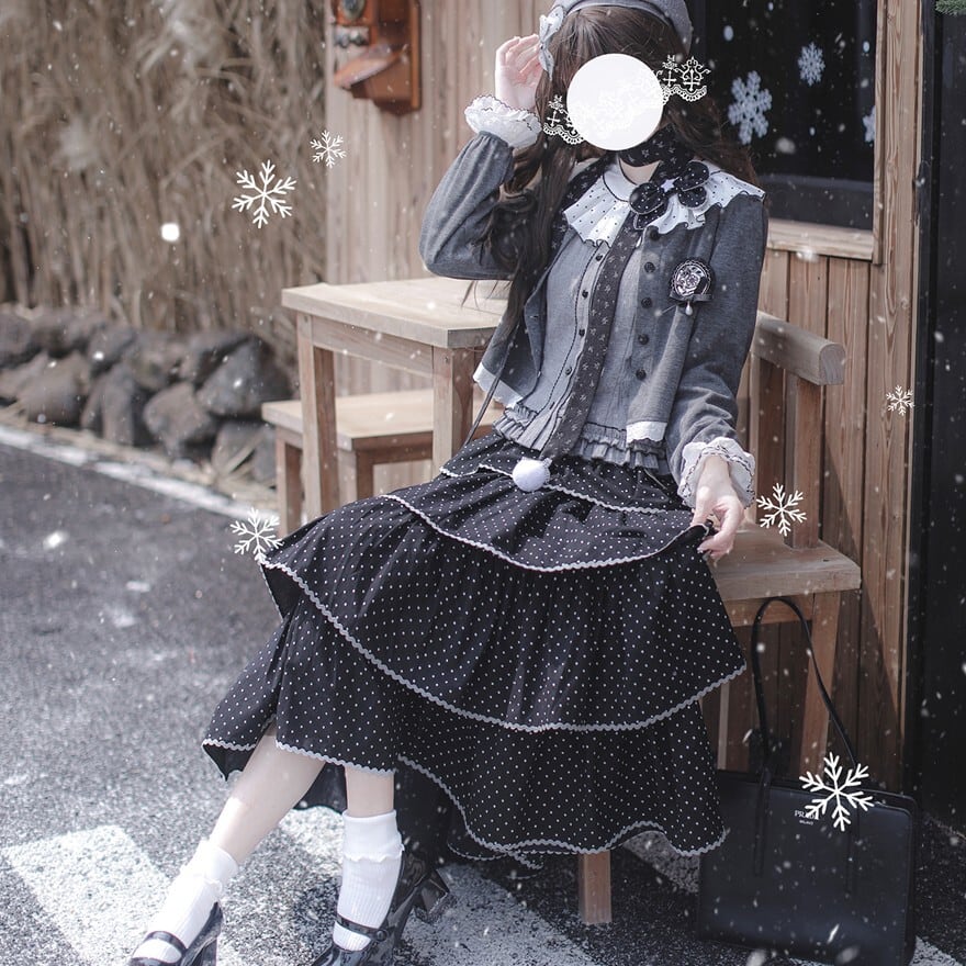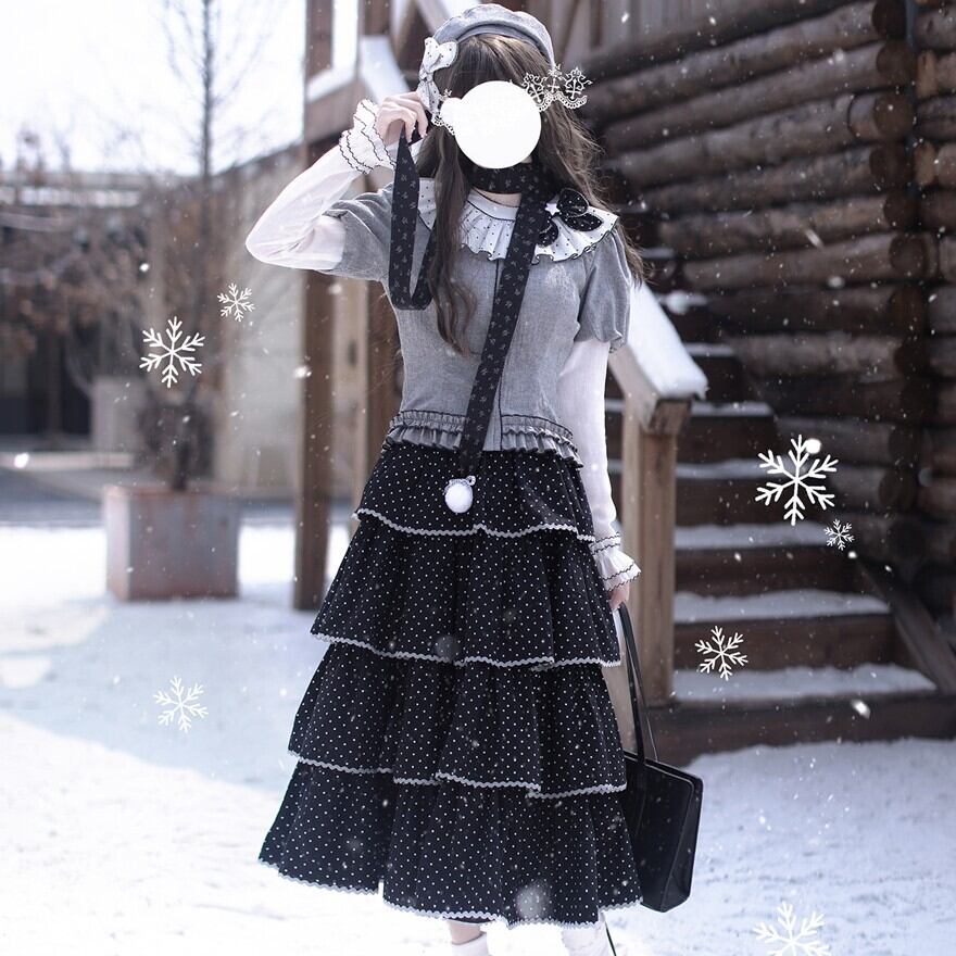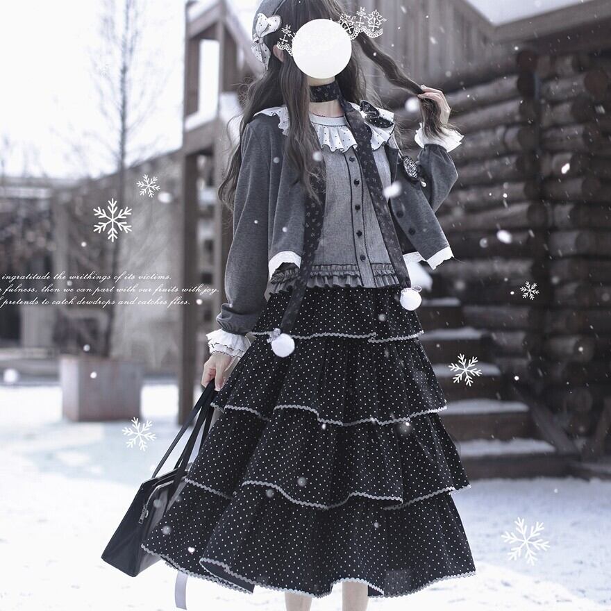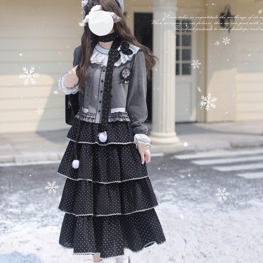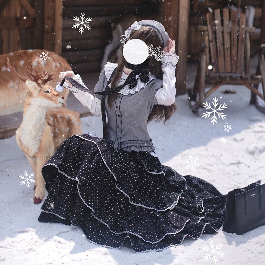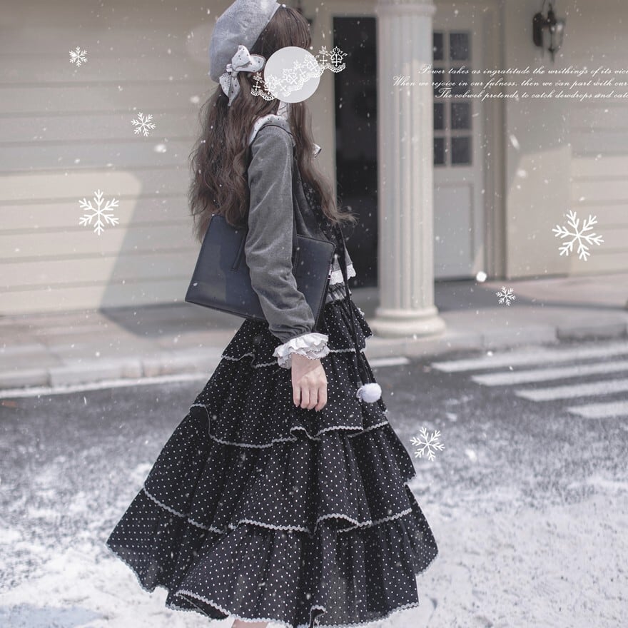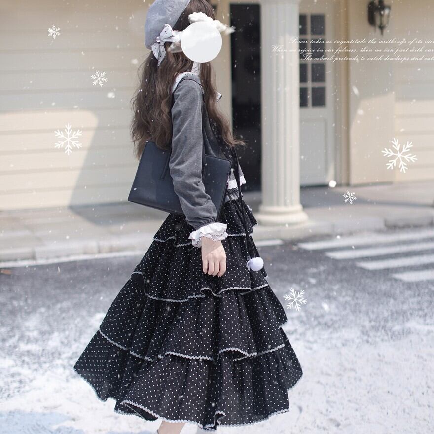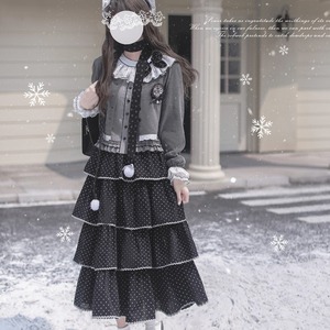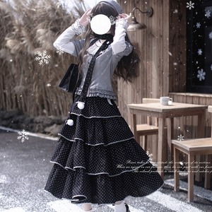 ブラックの生地に、オフホワイトのドット柄とフリル状のレースが段々に重ねられた、クラシカルロリータのスカートです。