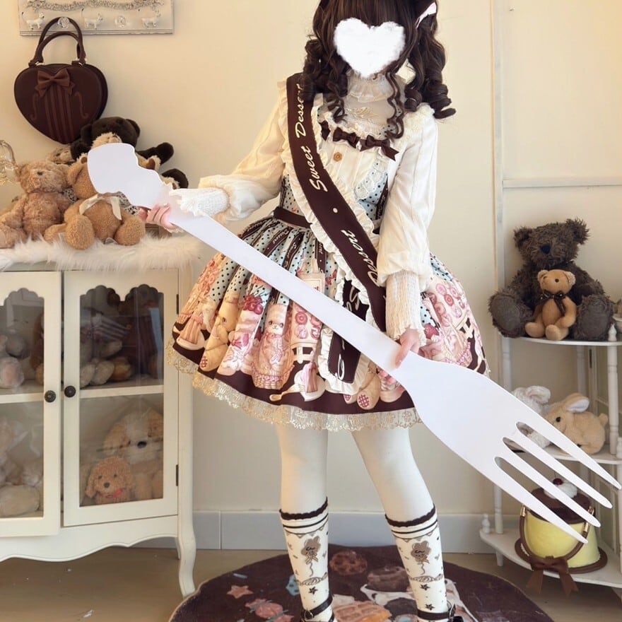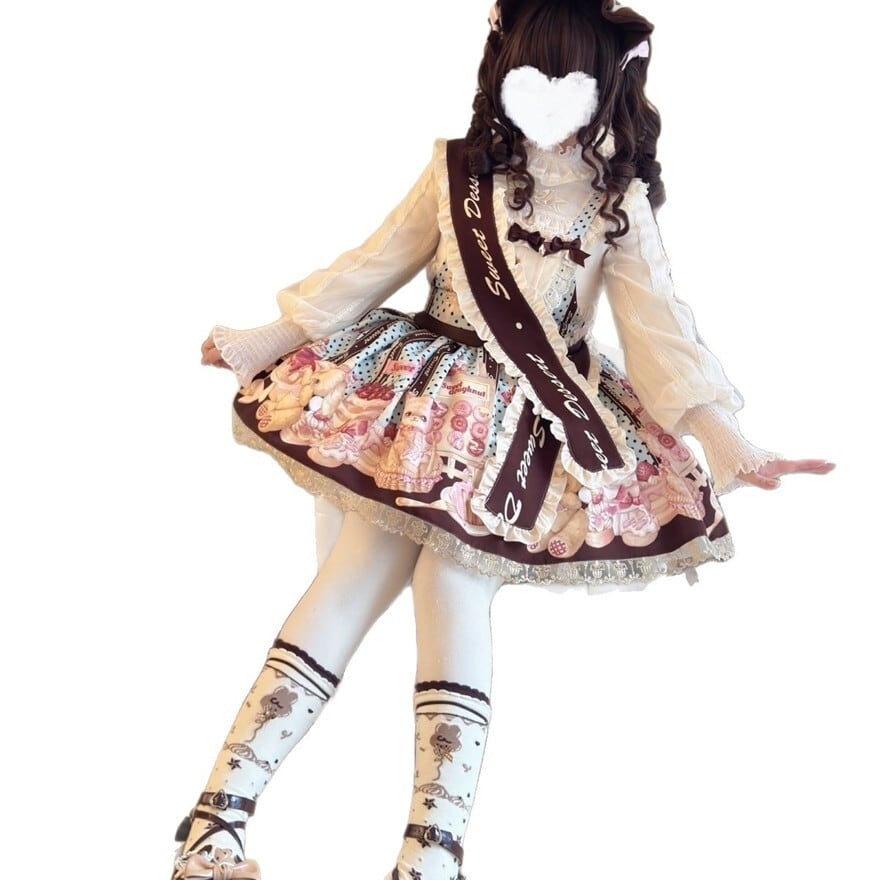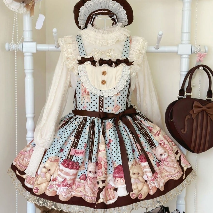 甘いお菓子とキュートなアニマルキャラクターが描かれた、とびきりスイートなロリータファッションを楽しめるセットです。