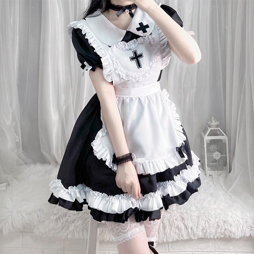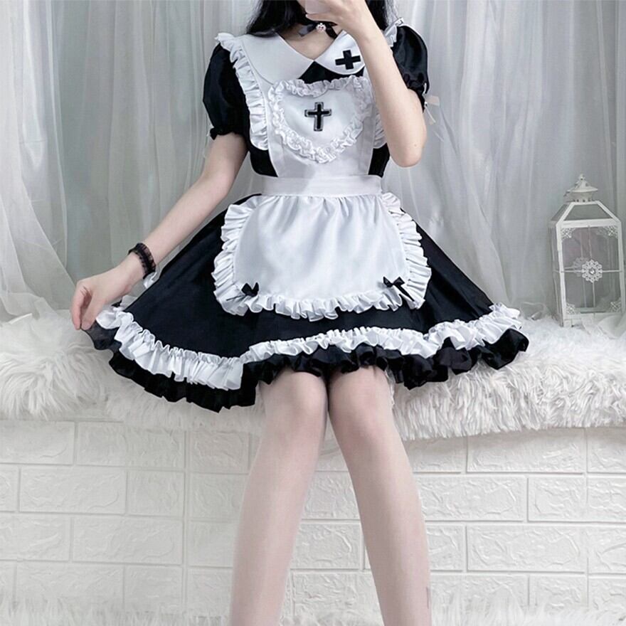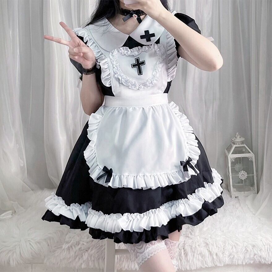 エプロン:ハート型で大きな十字架のモチーフが印象的な胸当てと、白いフリルの二段ティアードスカート部分からなるデザイン。取り外し可能で、着こなしに変化をつけられます。