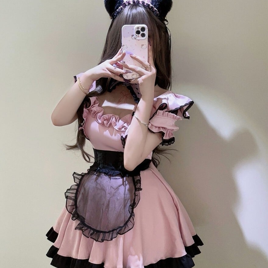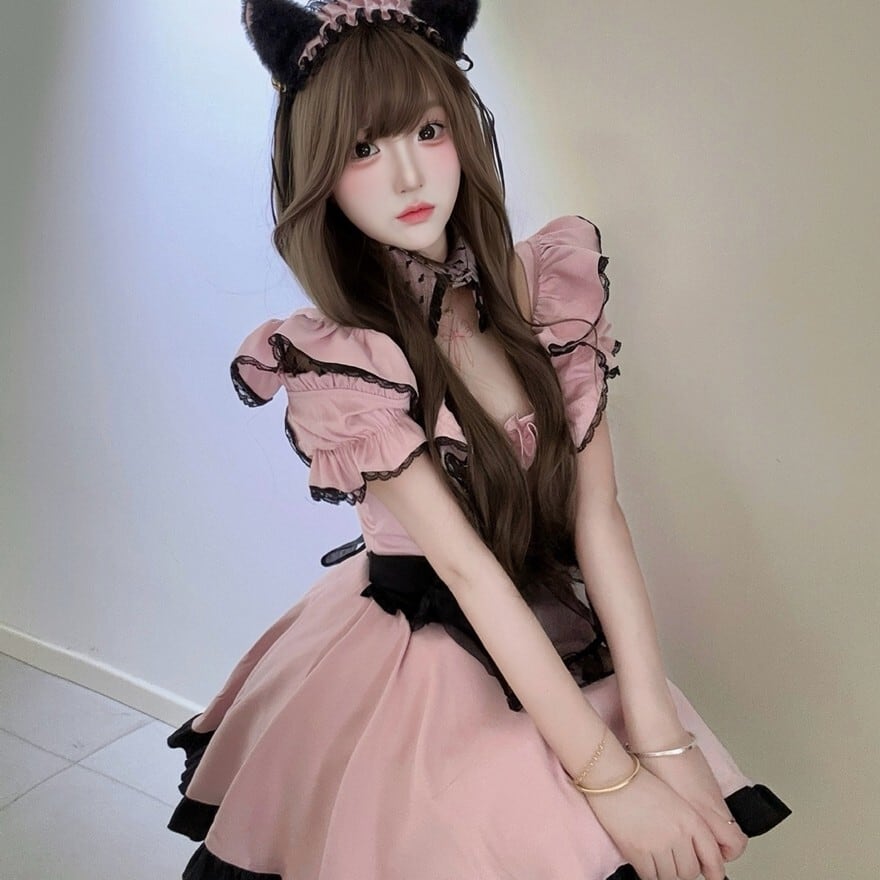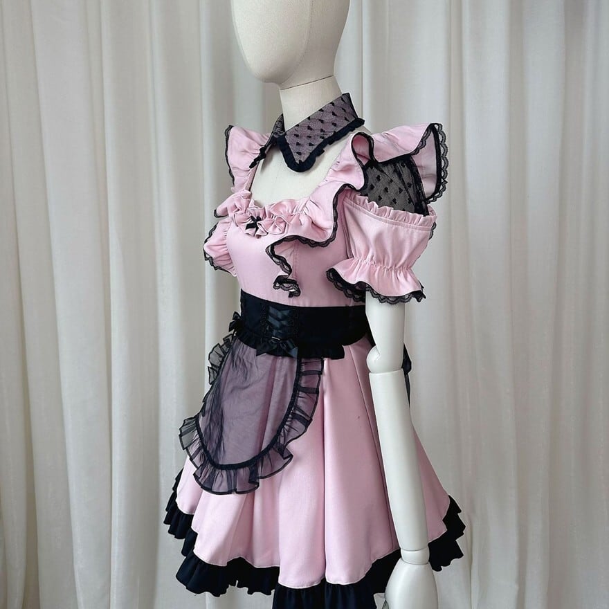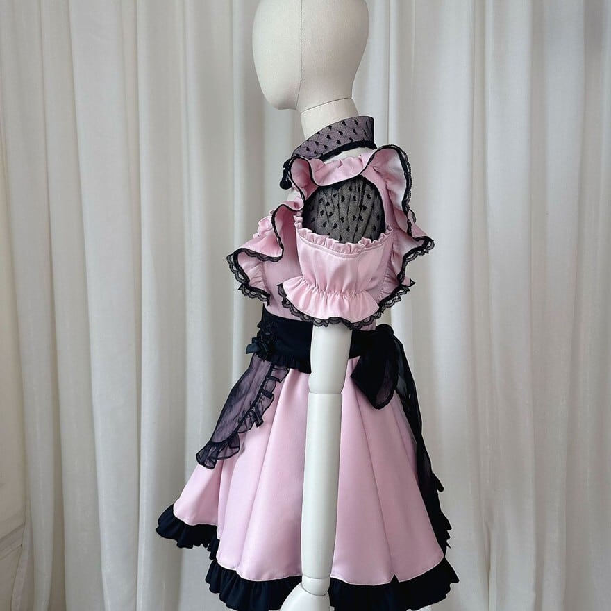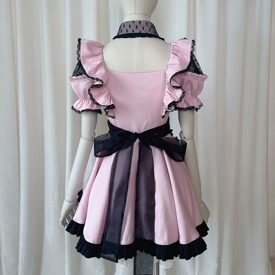 甘く可愛らしいベビーピンクを基調に、シックなブラックのフリルとレースをアクセントにした、ドーリーテイストのメイド服セットです。