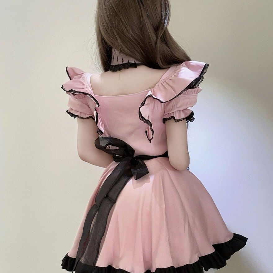 オフショルダー風のフリルが肩周りを華奢に見せ、黒いレースがあしらわれた小さなエプロンと大きなウエストリボンが、全体のデザインを引き締めています。