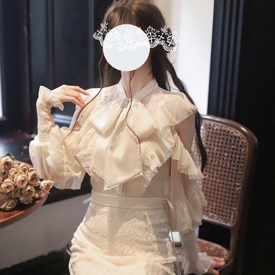 淡いアイボリーカラーの生地に、繊細なレースと大きなリボンタイがあしらわれた、クラシカルロリータ調のブラウスです。