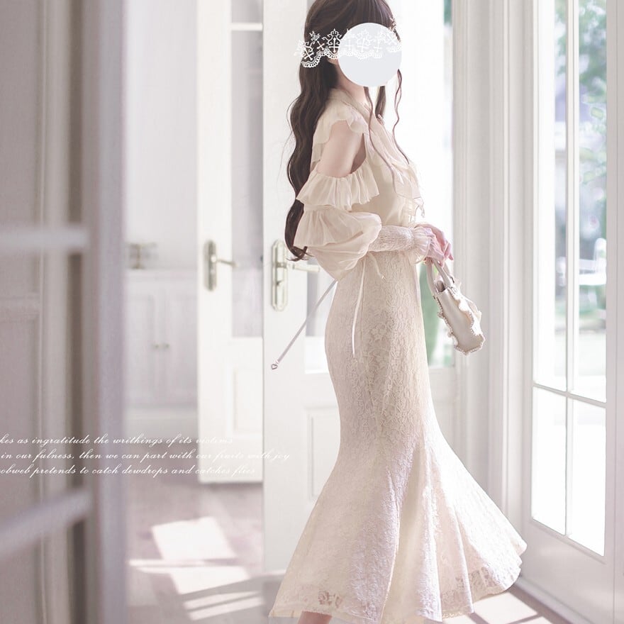 レースとフリルがたっぷり施されつつも、上品な色味が甘すぎず、洗練された雰囲気を演出します。