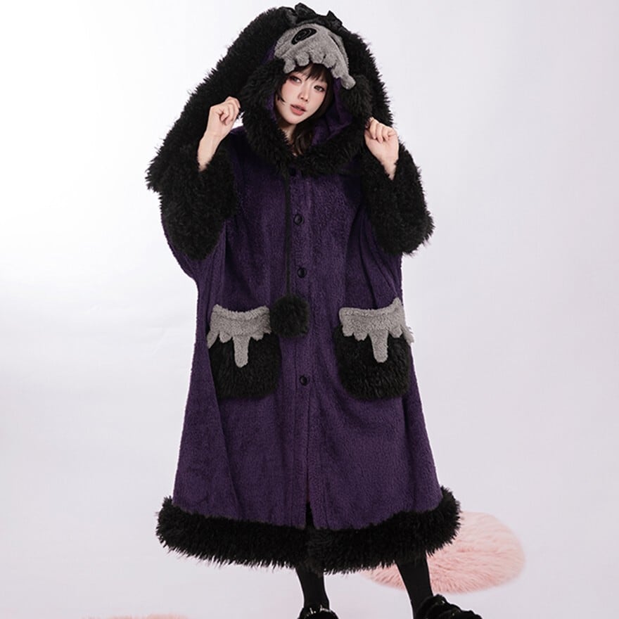 袖口や裾にはふわふわの長毛ファーがあしらわれ、暖かさとロリータらしい愛らしさを演出。個性的なデザインのポケットもアクセントになっています。背中には取り外し可能な可愛いしっぽも付いています。
