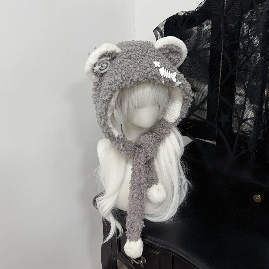 愛らしい丸い耳と、揺れるポンポン付きの紐がキュートな印象を与えつつ、サイドにあしらわれた「魚の骨」モチーフと星、十字架のチャームが、地雷系らしいシュールでダークな遊び心をプラスしています。