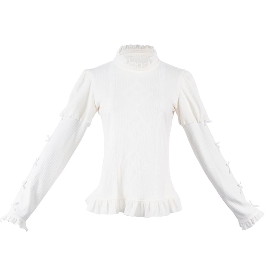 柔らかなオフホワイトの生地に、袖に並んだ小さなリボンがキュートなアクセントになった、インナー使いにぴったりの長袖トップスです。