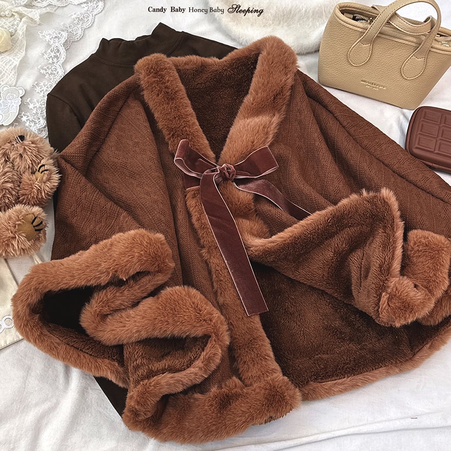 襟元から裾にかけてあしらわれたボリュームたっぷりのフェイクファーと、胸元の大きなリボンが印象的なポンチョコートです。