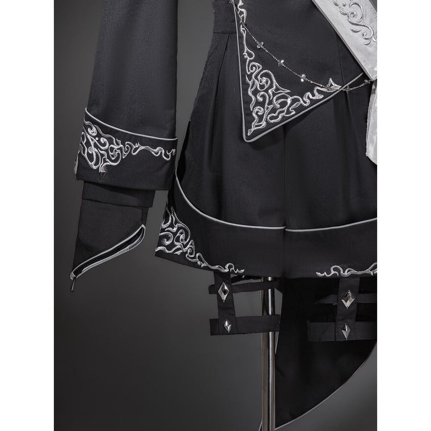 黒を基調とした生地に、シルバーの緻密なアラベスク(唐草模様)刺繍が映える、王子風ゴスロリセットアップです。中世ヨーロッパの騎士や、耽美な貴族を思わせる荘厳なデザインが特徴。