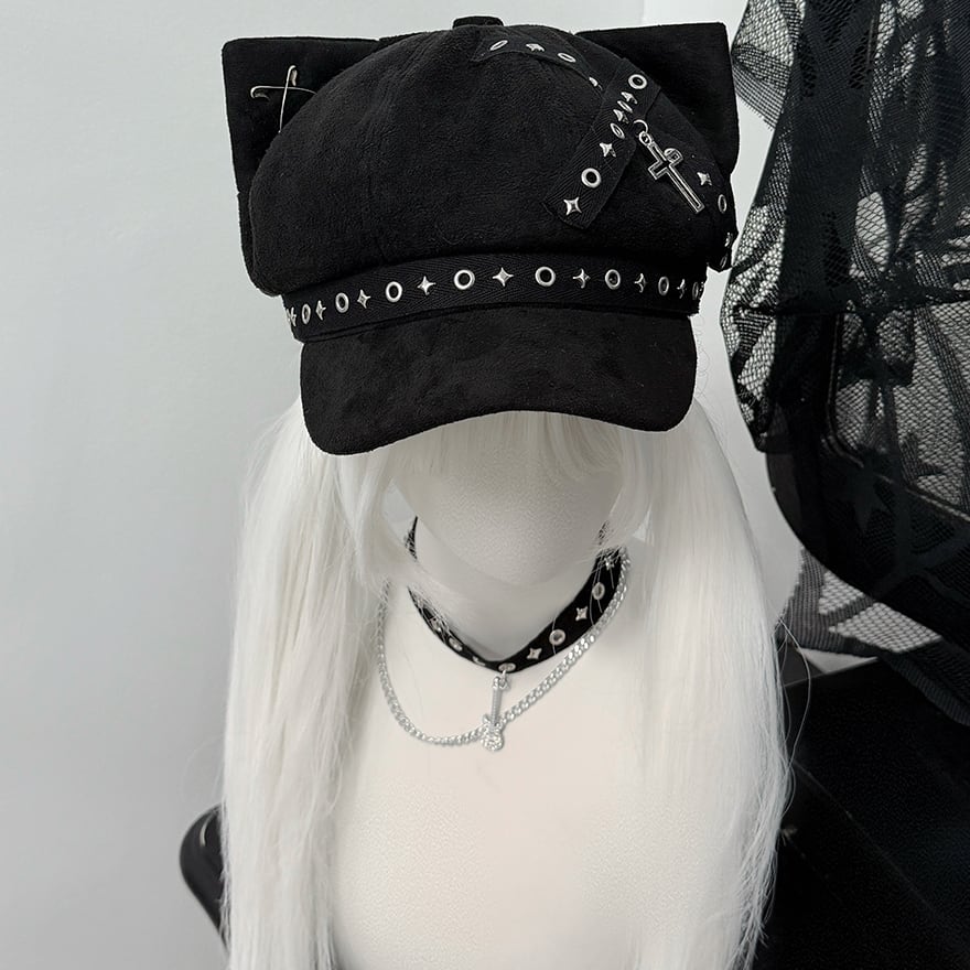 ブリム上のベルトや大胆に配置されたクロスストラップには、無数のハトメとスタッズが打ち込まれ、揺れる十字架チャームや安全ピンがハードなアクセントを加えています。