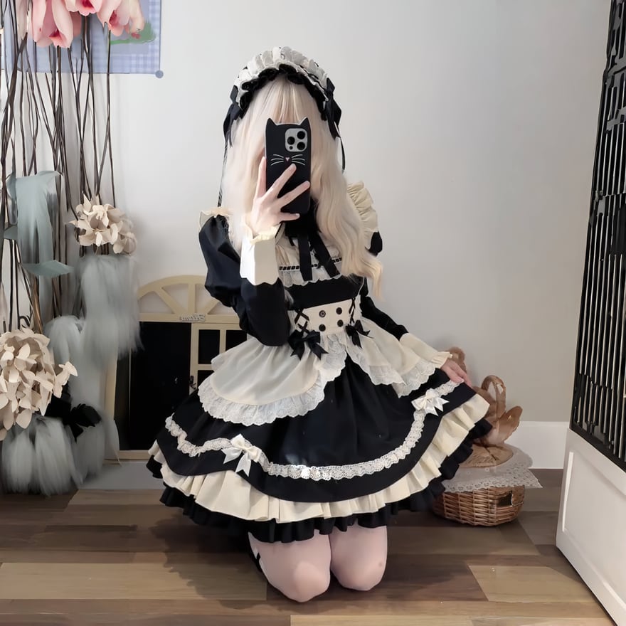 黒と白のコントラストが美しく、ヘッドドレスも含めたフルセットで、特別なイベントや撮影会に最適です。