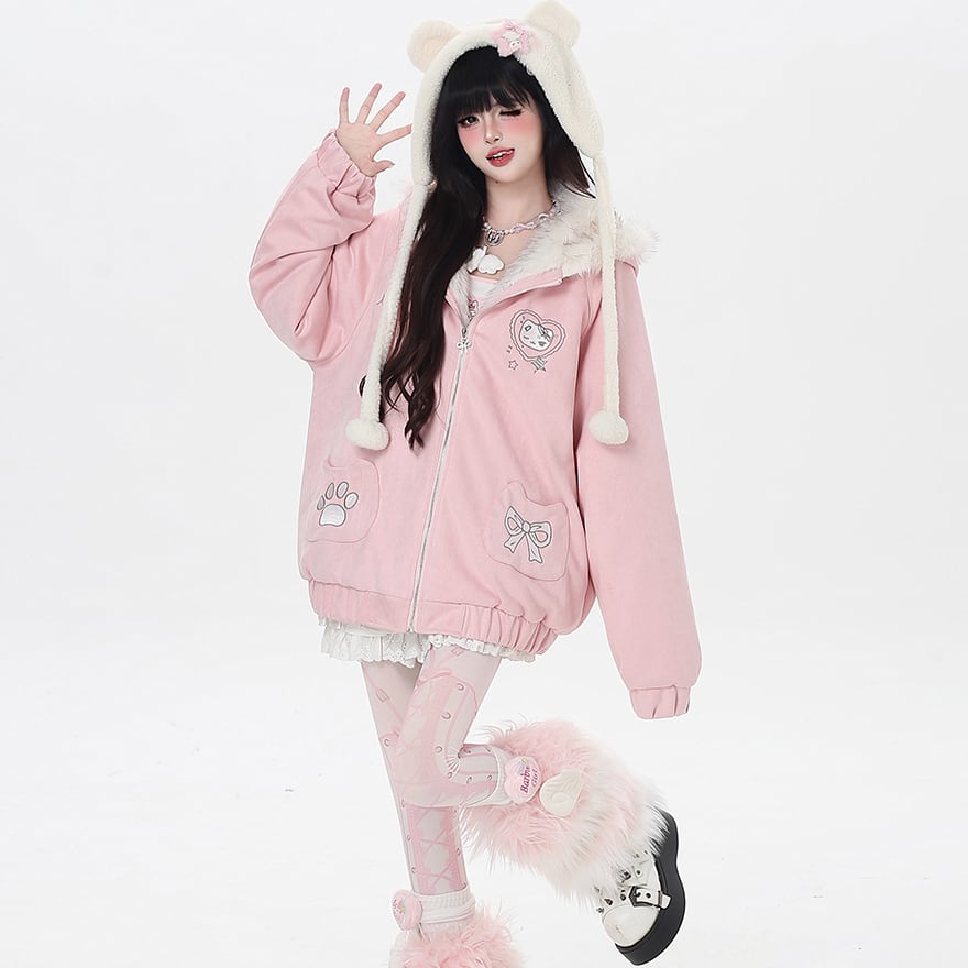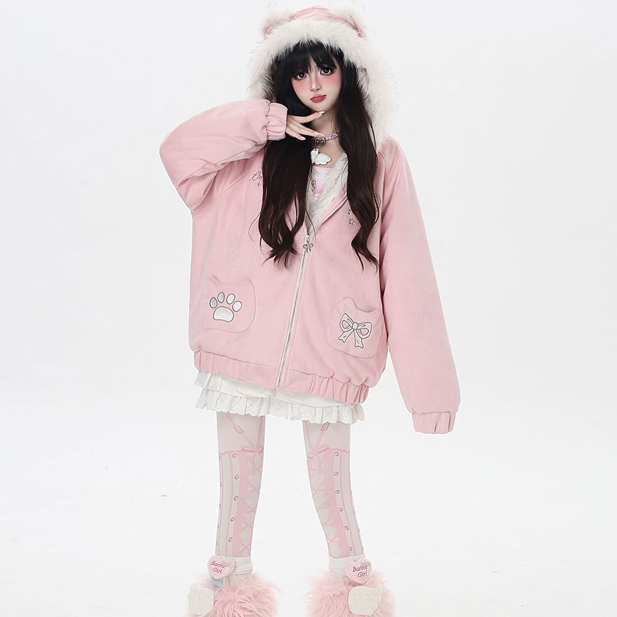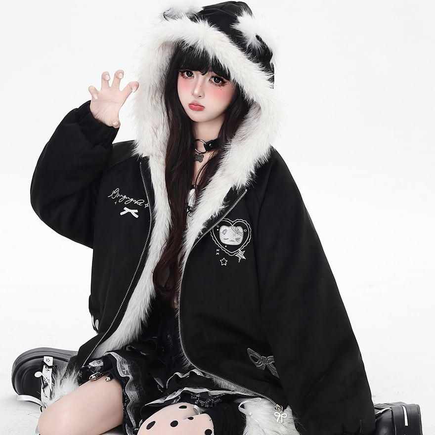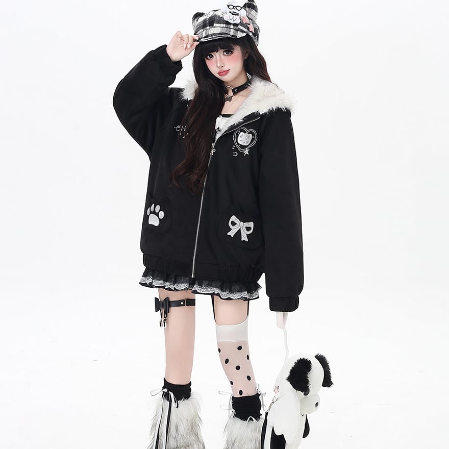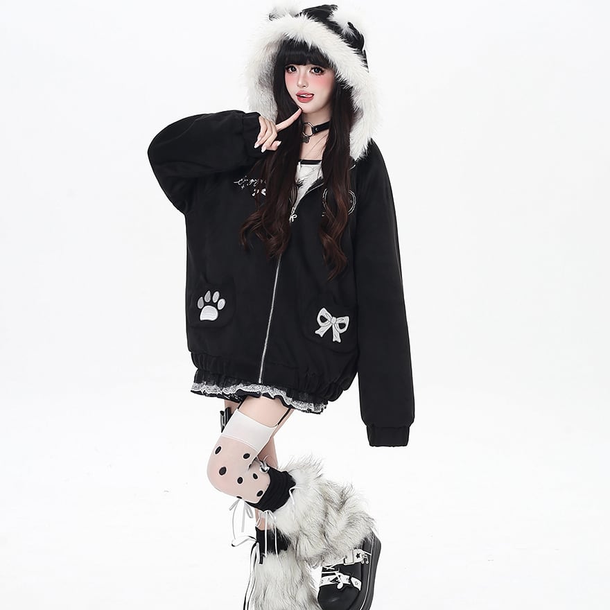 地雷系 萌え猫 フード付き コットンジャケット ゆったり 裏地 防寒仕様 ふかふか パンクロリィタ