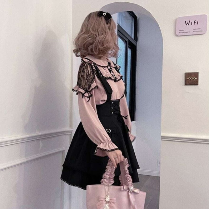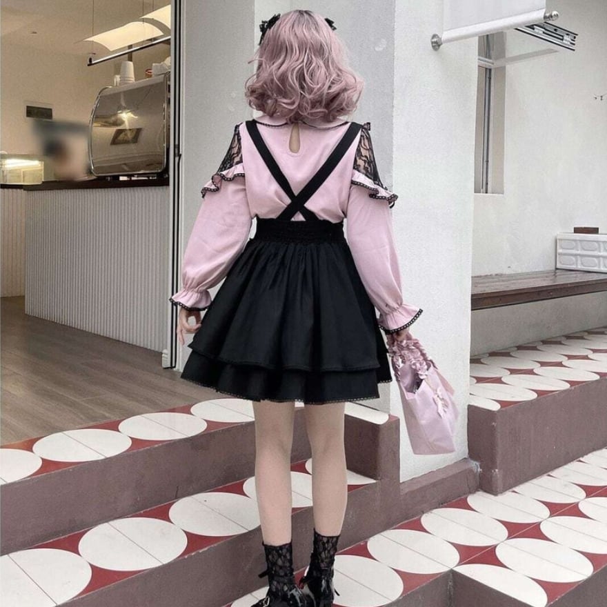 写真のブラウスと相性抜群!地雷系・量産型ファッションのためのミニ丈サスペンダースカートです。