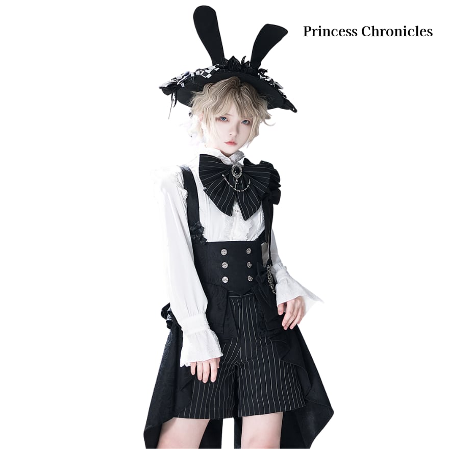 ウエスト部分には、ボタン装飾やフリル、チェーンなどが施されたハイウエストのコルセットデザインで、スタイルアップ効果も抜群です。前面はショート丈で動きやすく、活動的な男装カフェのキャスト衣装としても最適です。