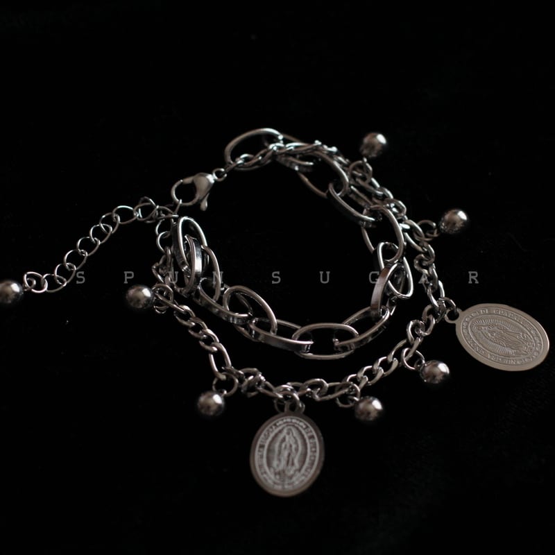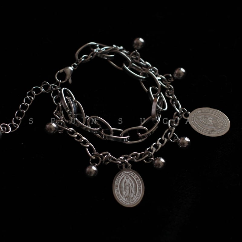 ごつめのオーバルチェーンと華奢なボールチェーンが重ねられた、存在感抜群の2連ブレスレット。そこに揺れるのは、慈愛に満ちた聖母マリアのメダイ(チャーム)。**「救い」と「闇」**が共存する、あなたの複雑な世界観を表現するブレスレットです。手元から放たれるダークでミステリアスな輝きで、周りの視線を独り占めしましょう。