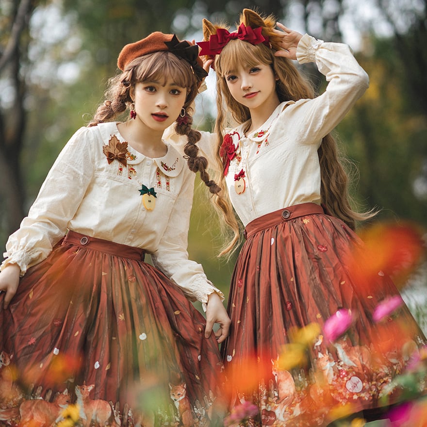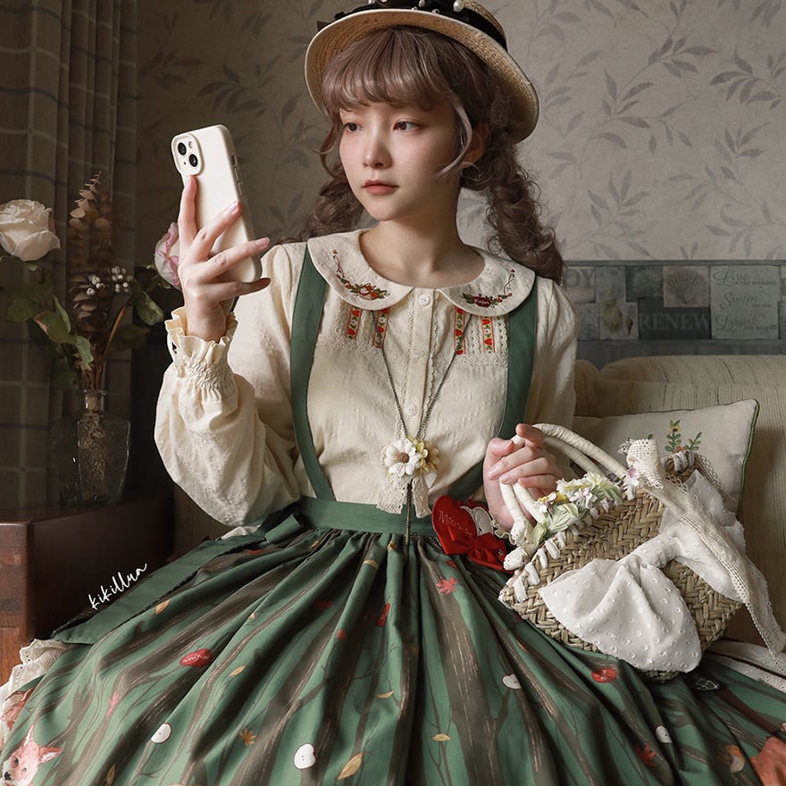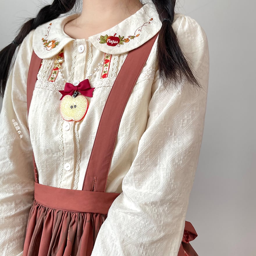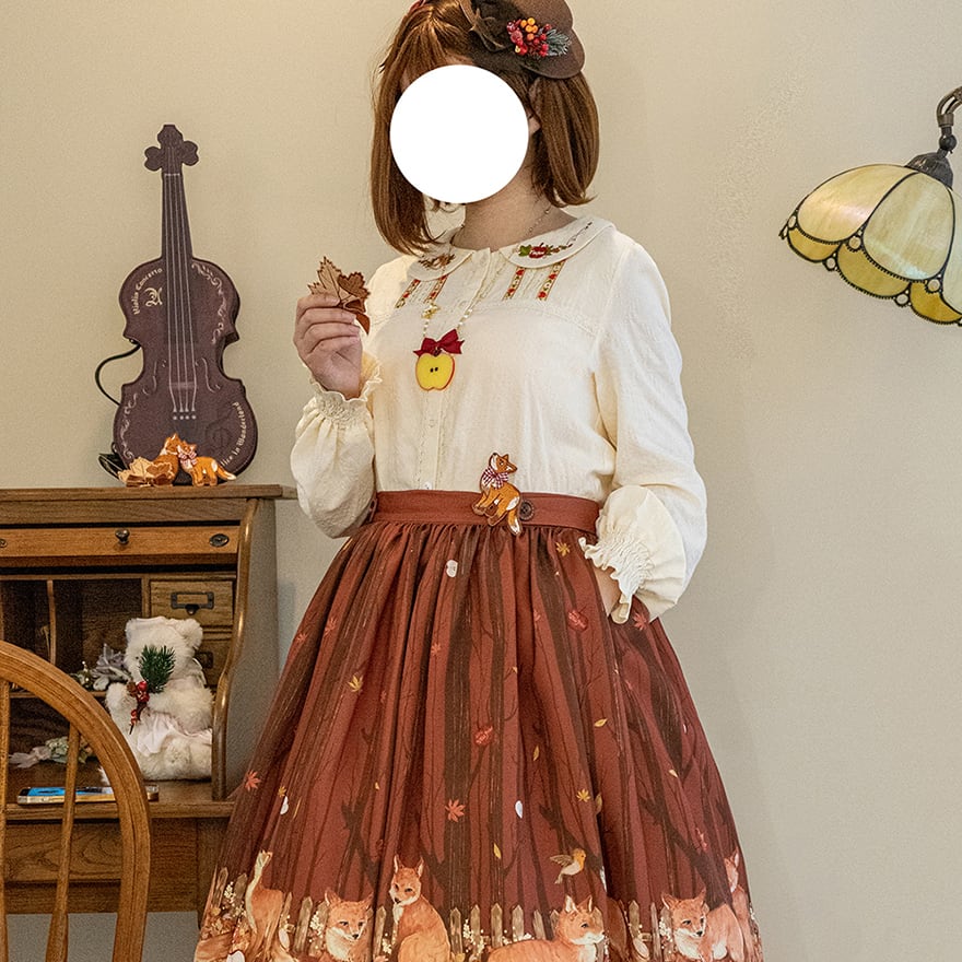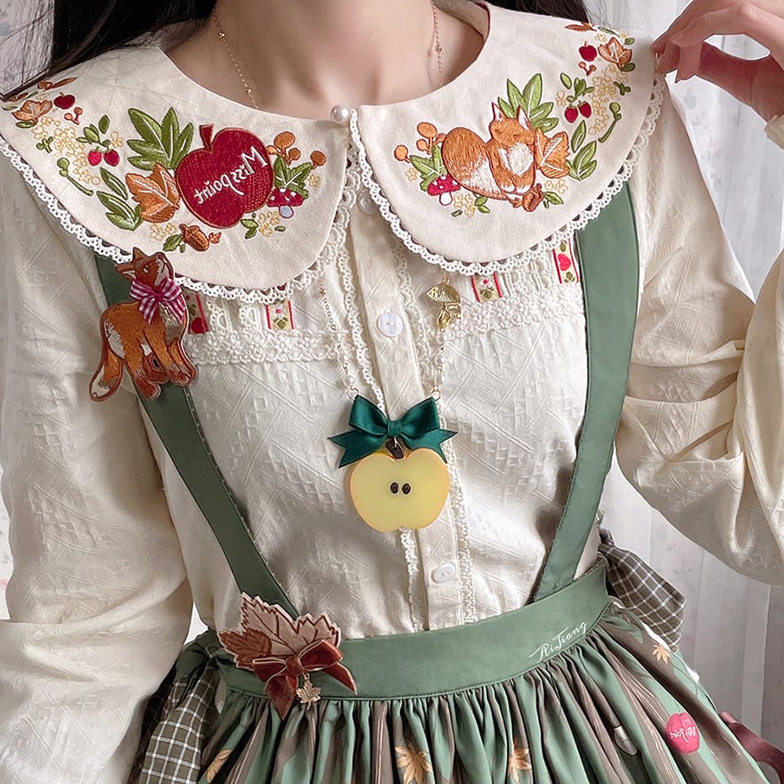 丸襟にはキツネやリンゴなど、森を連想させるモチーフが繊細に描かれ、胸元のピンタックとレースが英国カントリー風の上品さを演出します。