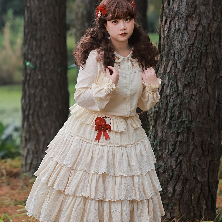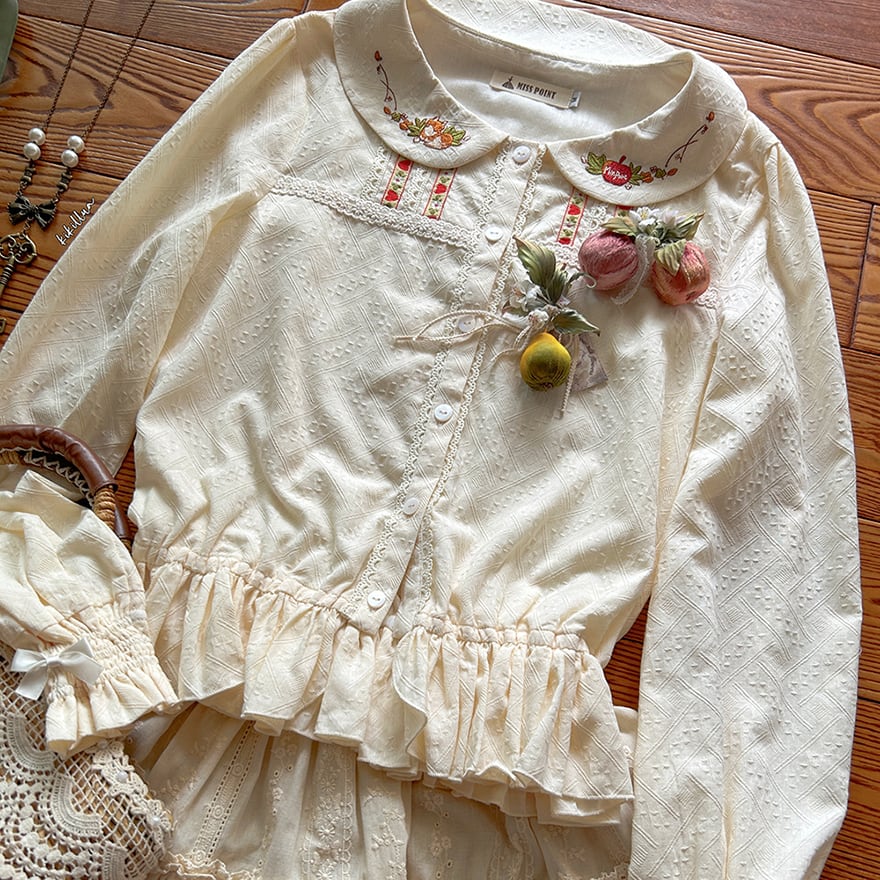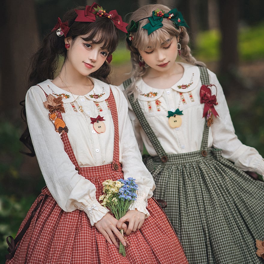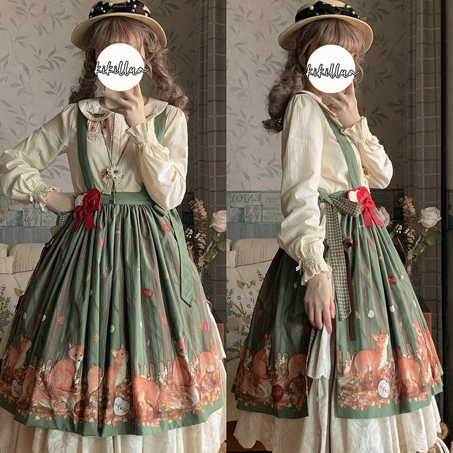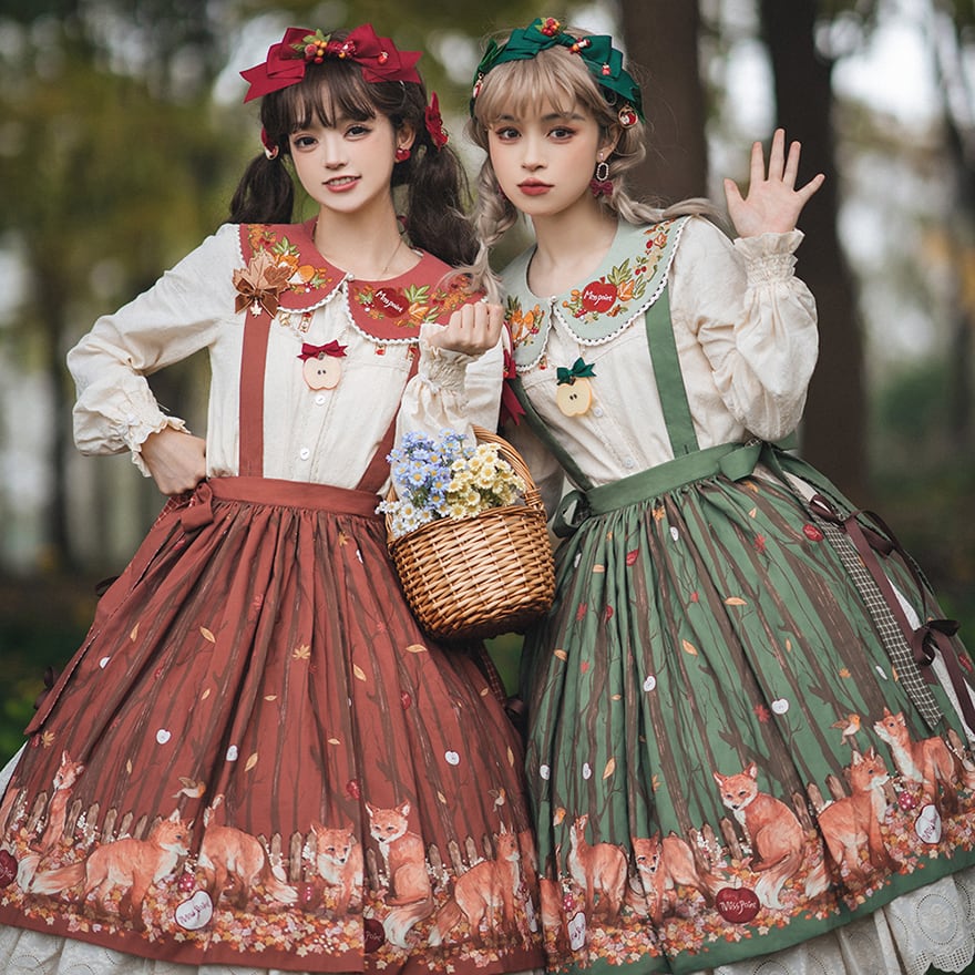 丸襟にはキツネやリンゴなど、森を連想させるモチーフが繊細に描かれ、胸元のピンタックとレースが英国カントリー風の上品さを演出します。