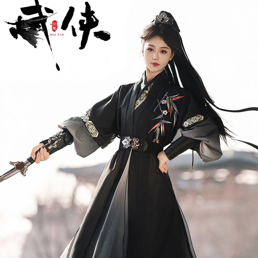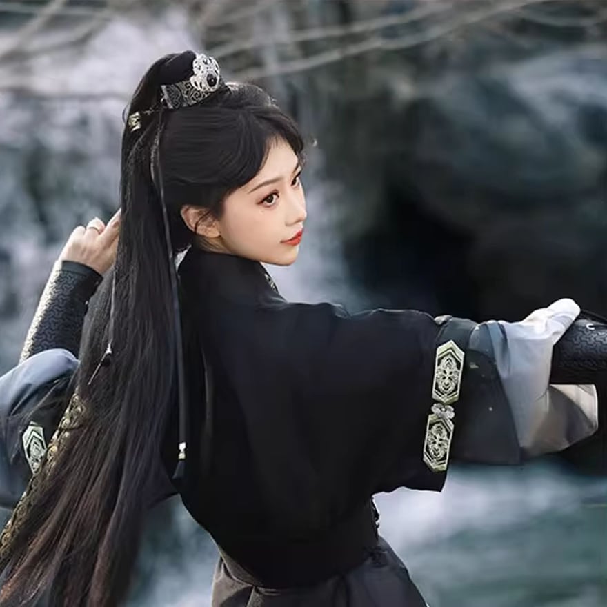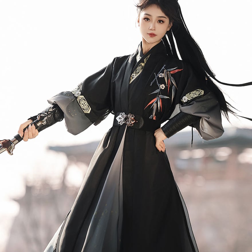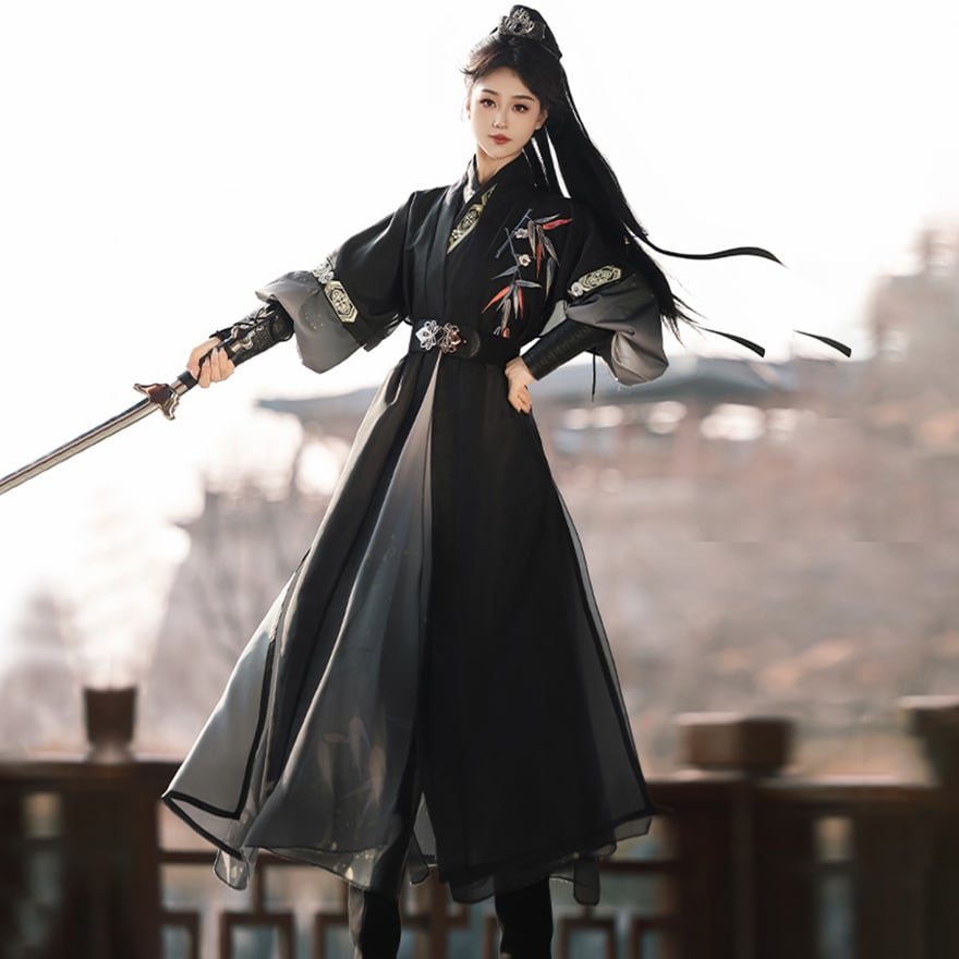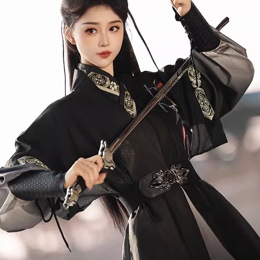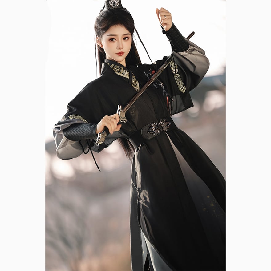 金属バックルのついた太めのウエストベルトや、手甲(リストガード)を模した袖のデザインが、単なる漢服にはない軍服風の凛々しさをプラス。