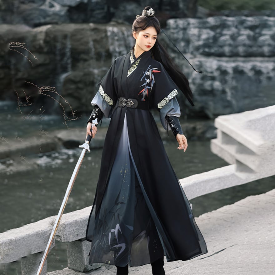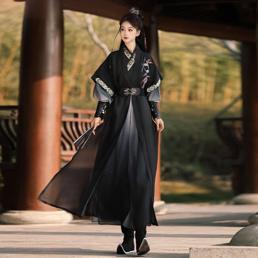 漆黒の生地をベースに、裾に向かって流れるようなグラデーションが美しい、漢服スタイルのセットアップです。