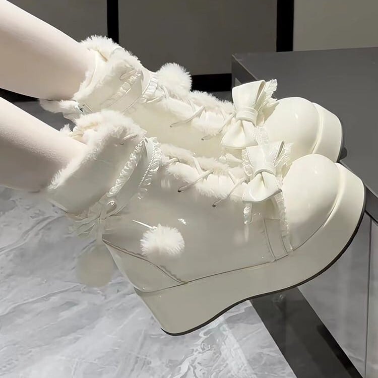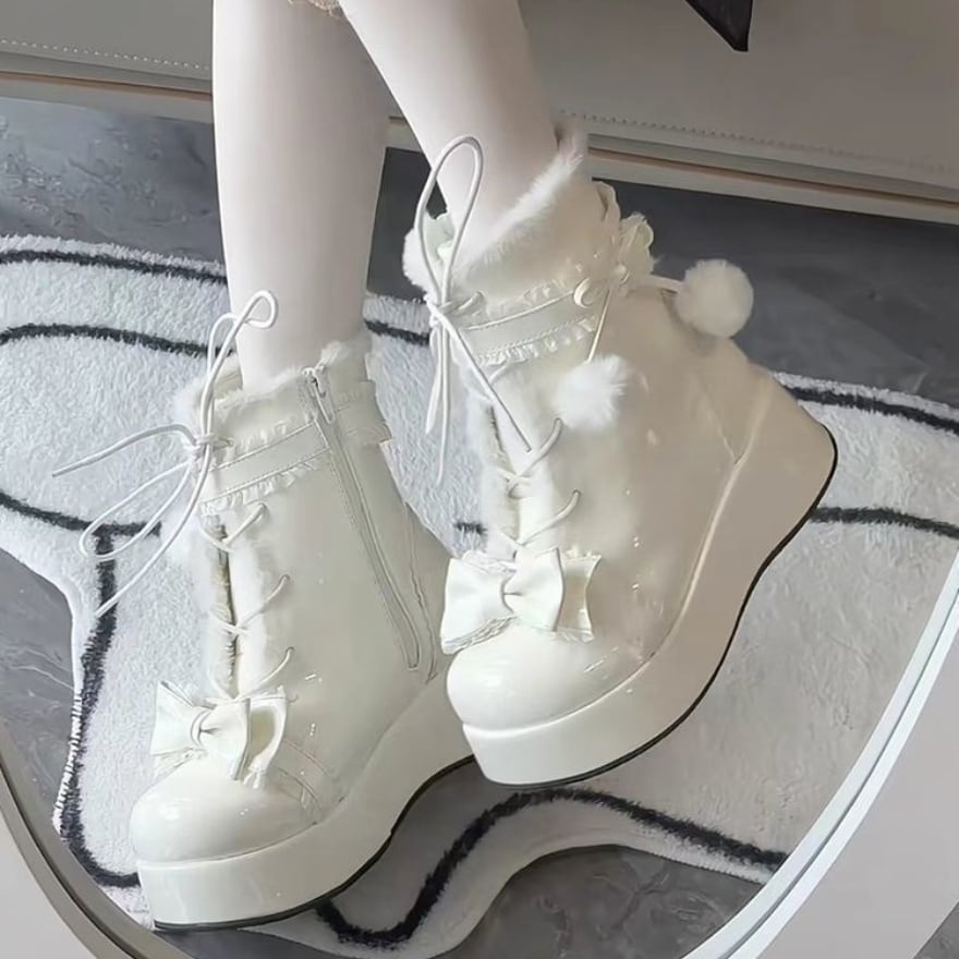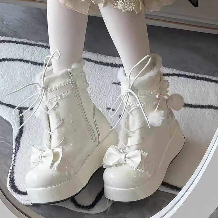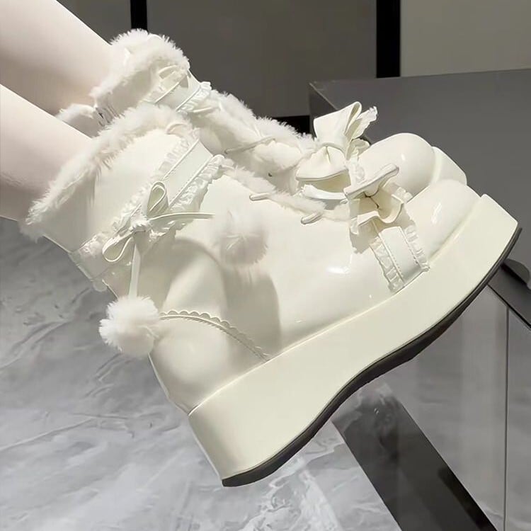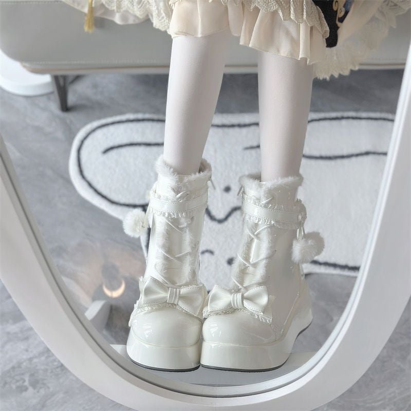【雪の妖精】ロリータ 厚底 ブーツ 白 [ファー/リボン/ポンポン] 甘ロリ 靴 ゴスロリ 夢かわいい 冬