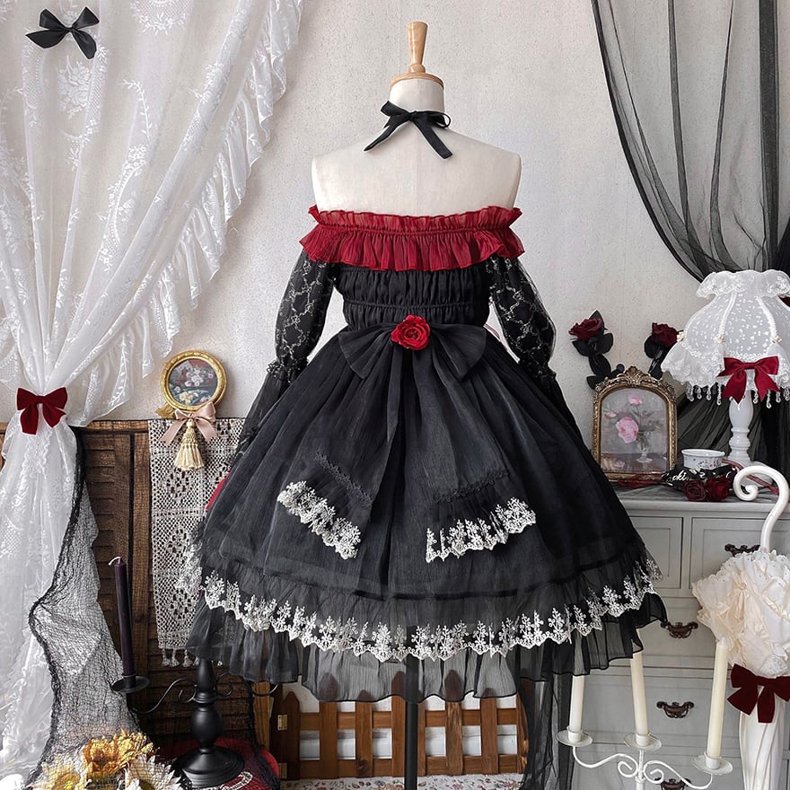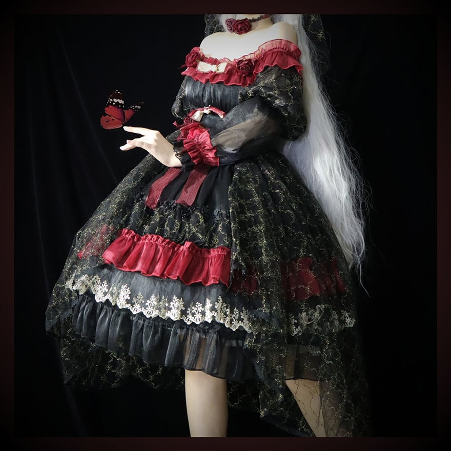 ブラックのチュール生地をベースに、深紅のフリルと煌びやかなゴールドの装飾が贅沢にあしらわれた、ゴシックロリータのドレスセットアップです。