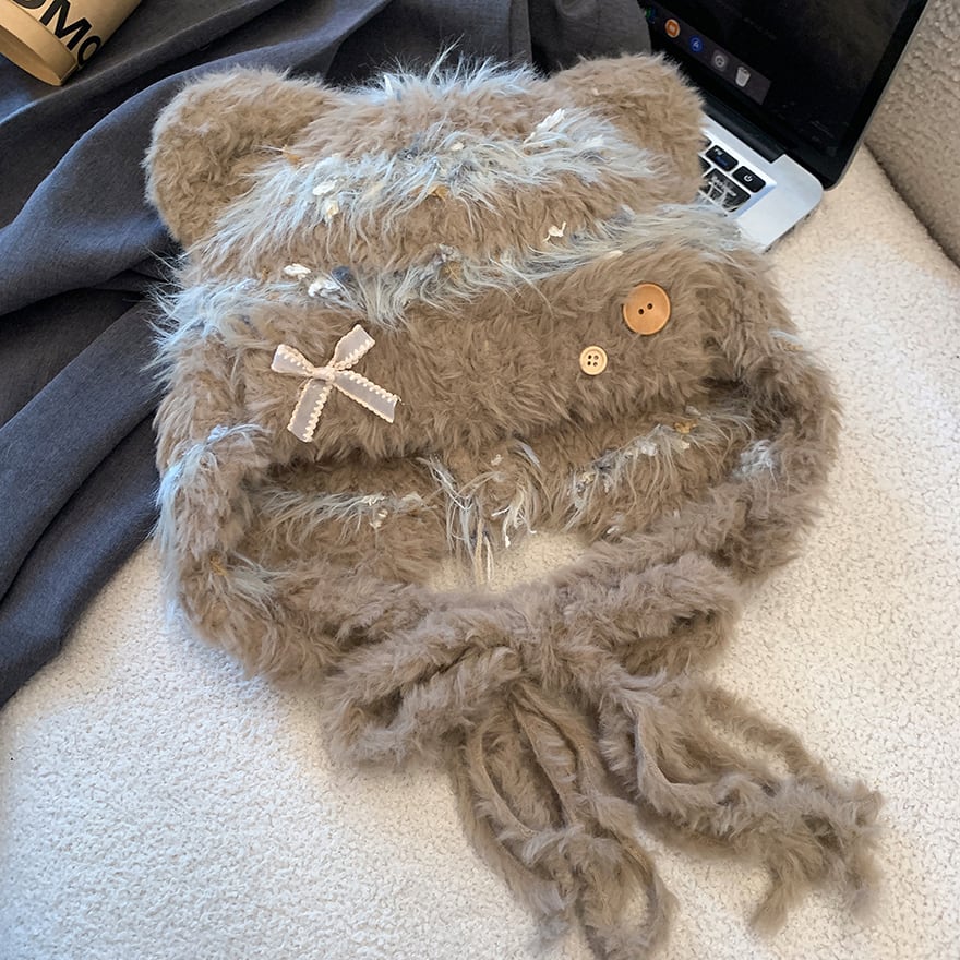 耳まですっぽりと覆うデザインと、長く垂れた紐が特徴的で、デザイン性だけでなく防寒性にも優れています。