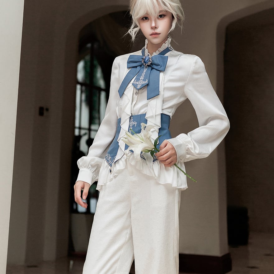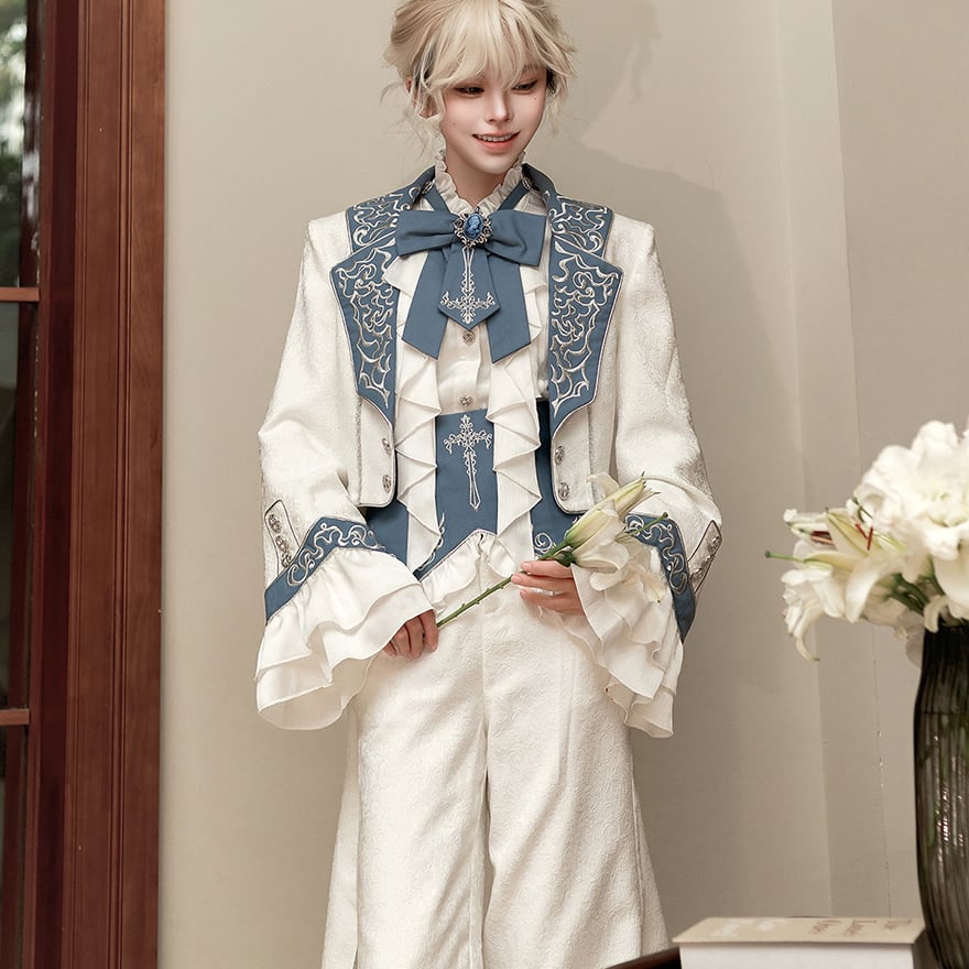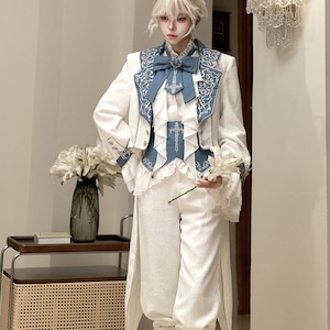 上品な光沢感のあるホワイトの生地をベースに、襟元やリボンにくすみブルーのアクセントカラーを配した、皇子系のセットアップ衣装です。