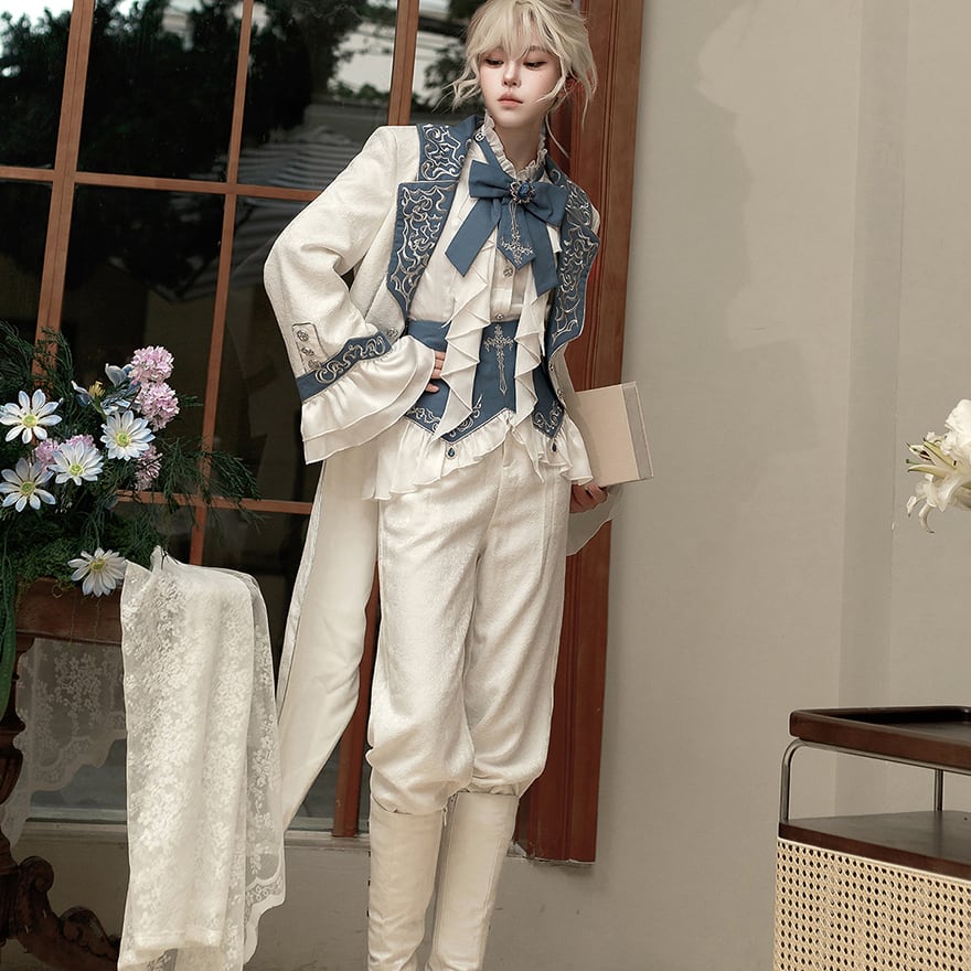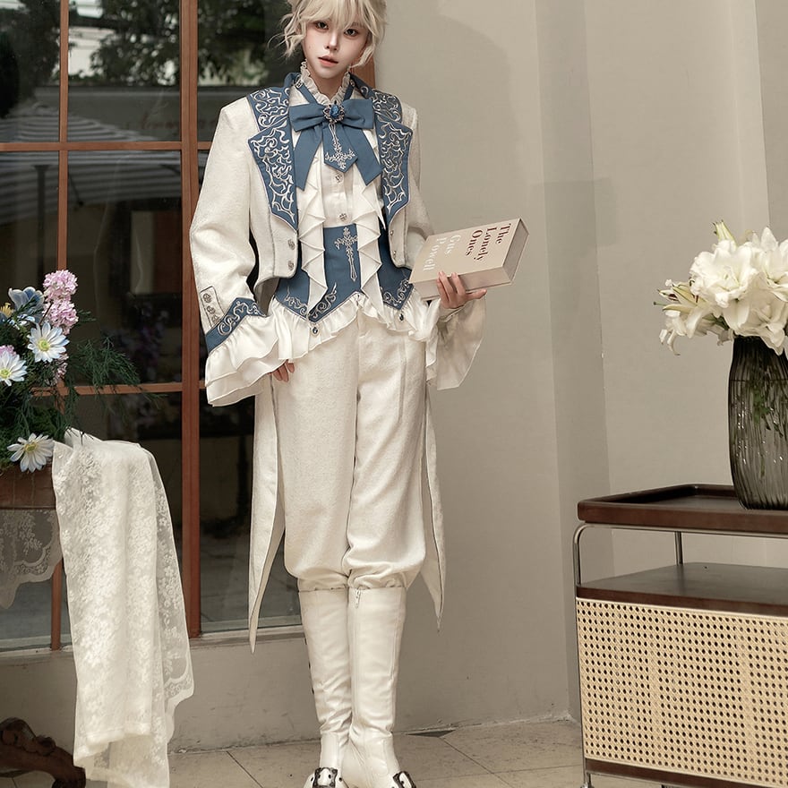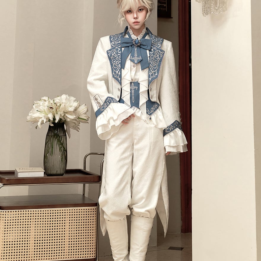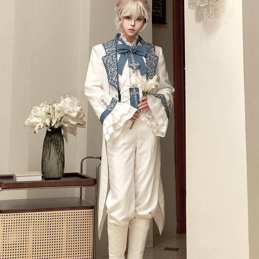 燕尾服のように長く伸びたジャケットの裾や、繊細な刺繍があしらわれたラペル、そして袖口から広がる優雅なフリルが、気品あふれる麗しいシルエットを演出します。