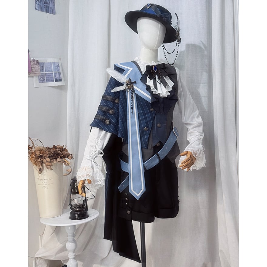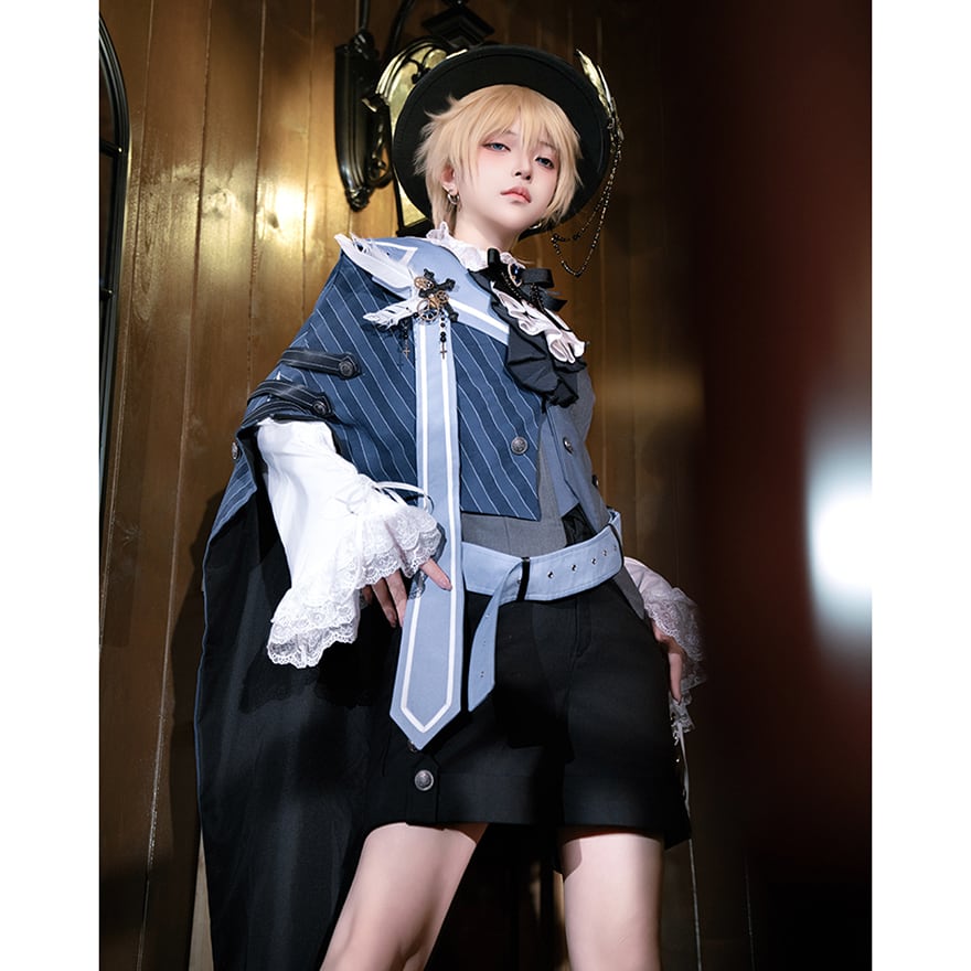 ネイビーとグレーを基調としたシックなベストに、アシンメトリーなストライプ柄マントが映える、豪華な王子系少年装セットです。