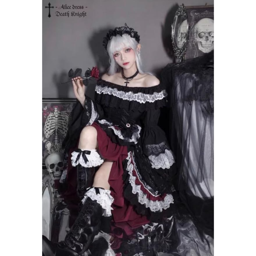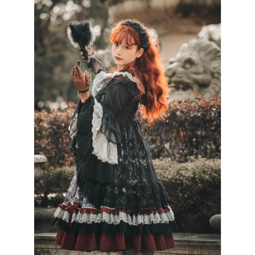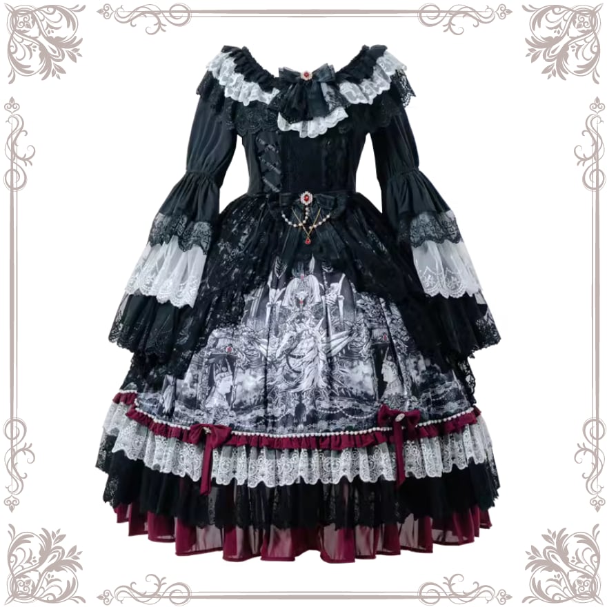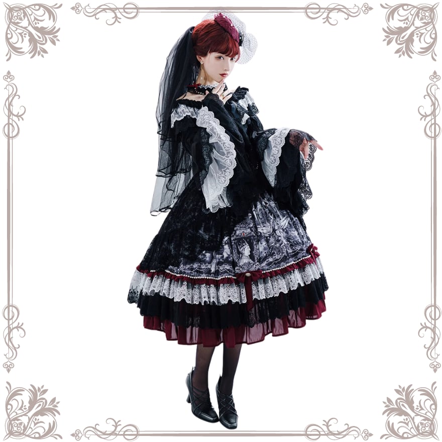 幾重にも重ねられたレースとフリル、そして物語を感じさせる暗黒童話のようなオリジナルプリントが、貴族的な雰囲気を演出。即納でお届けするため、急なイベントや撮影会にも間に合います。