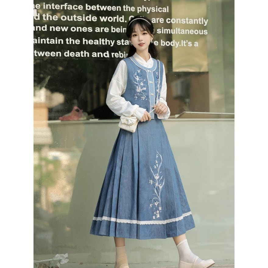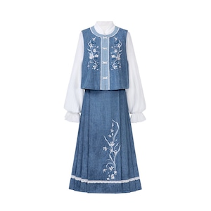 【華ロリ】デニム風 刺繍 セットアップ 中華ロリータ ベスト スカート 3点セット