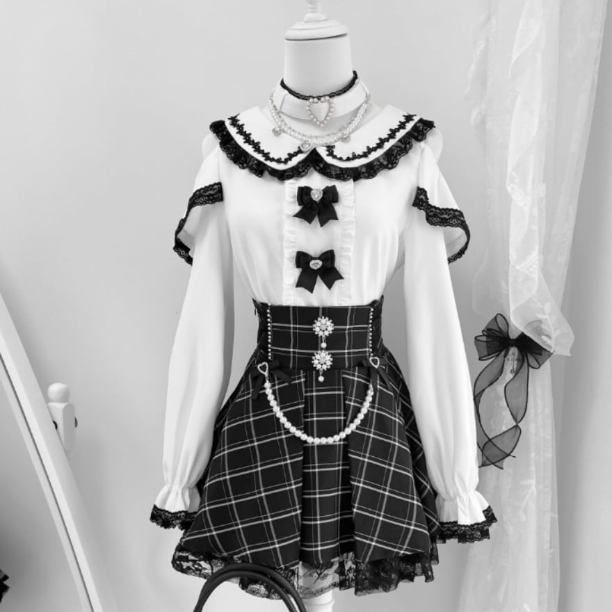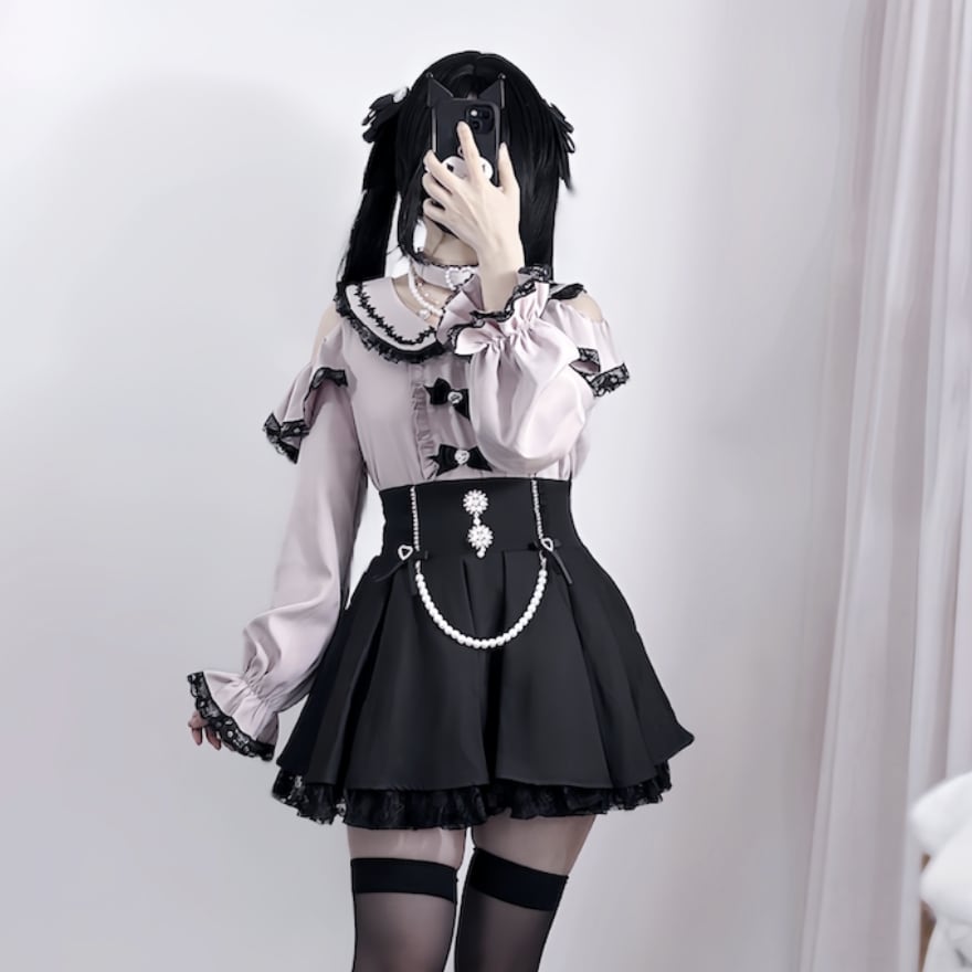 地雷系 量産型 オープンショルダー ブラウス 甘辛コーデ リボン フリル レース付き