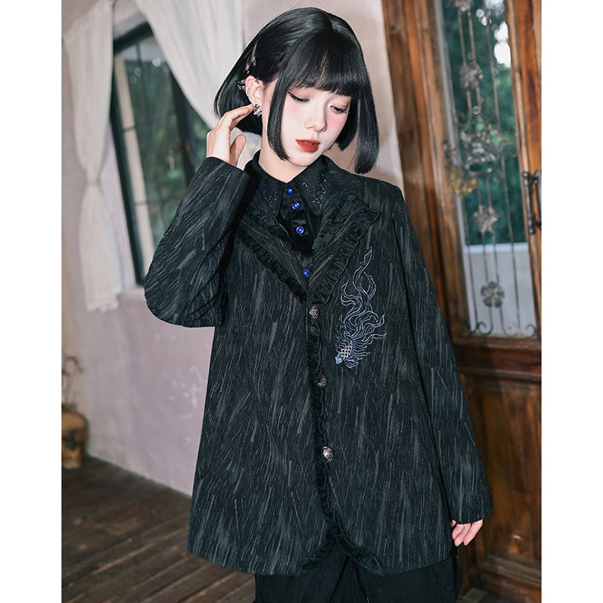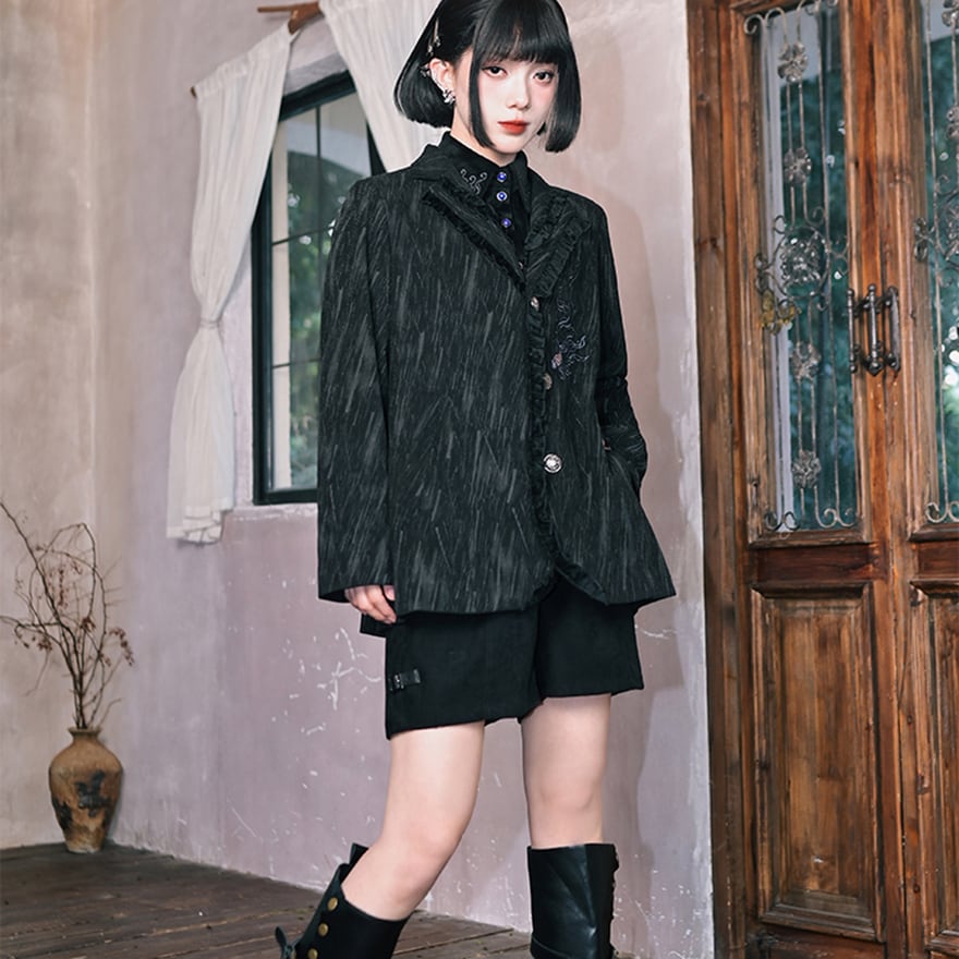 襟元から前立てにかけてあしらわれたフリルのディテールと、存在感のあるアンティーク調のシルバーボタンが、ゴシックでクラシカルな雰囲気をより一層引き立てます。