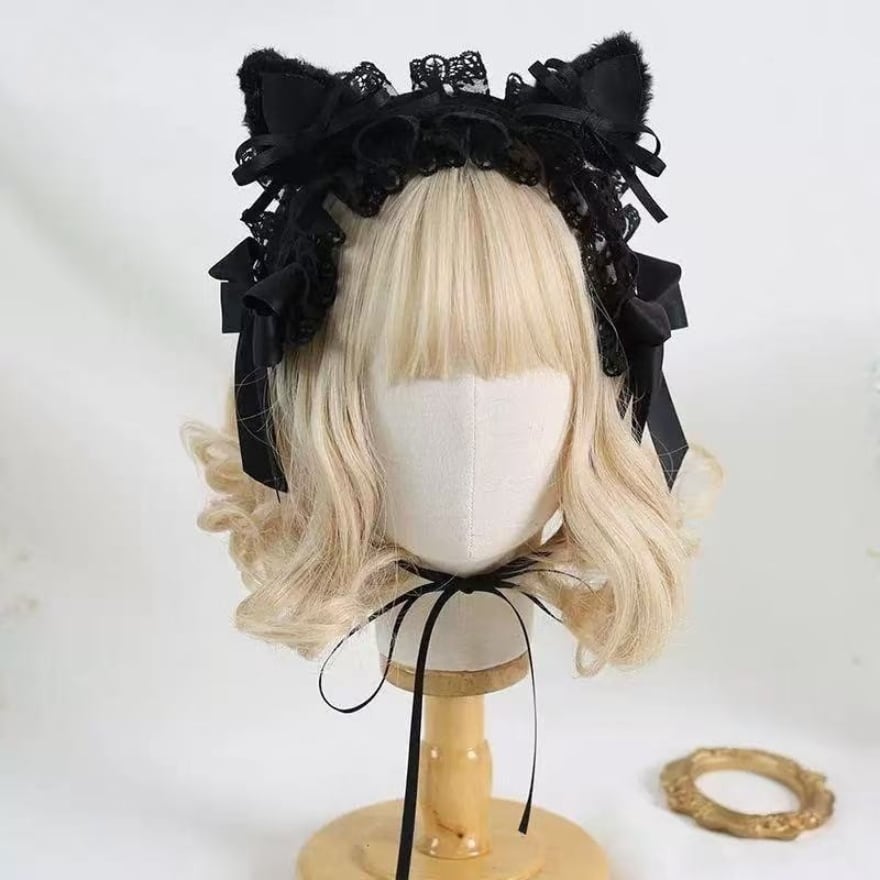 ふんわりとした猫耳モチーフに、レースとリボンを重ねた甘さとダーク感が共存する、地雷系・ロリィタ向けヘアドレスです。