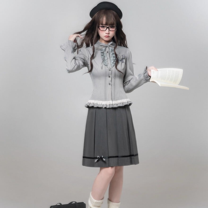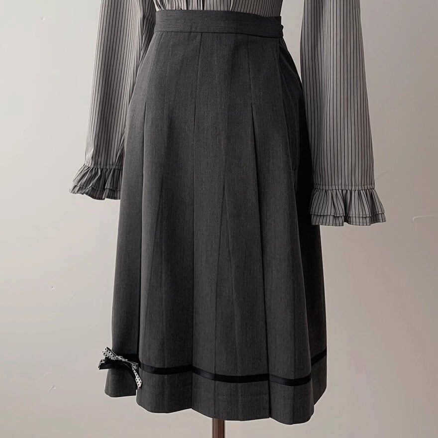 スカートはプリーツ仕様で、裾にはリボンと黒のトリムが施され、ドーリーな印象を与えます。