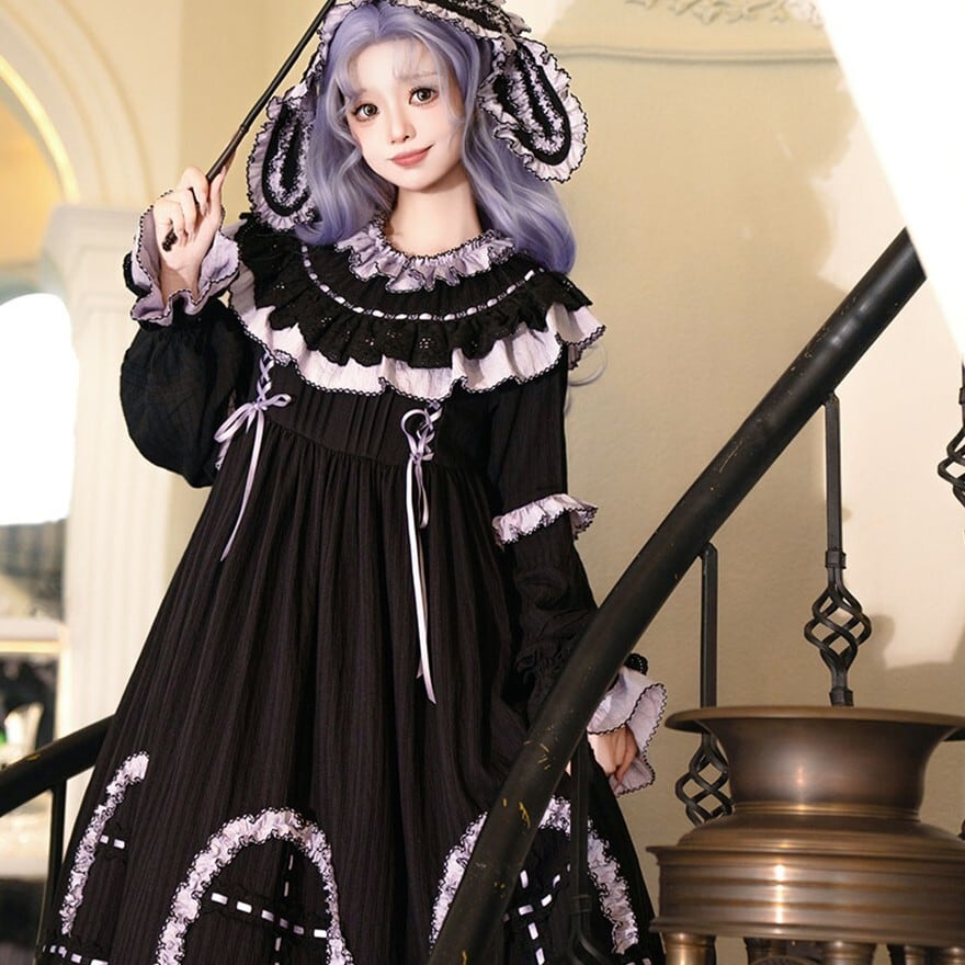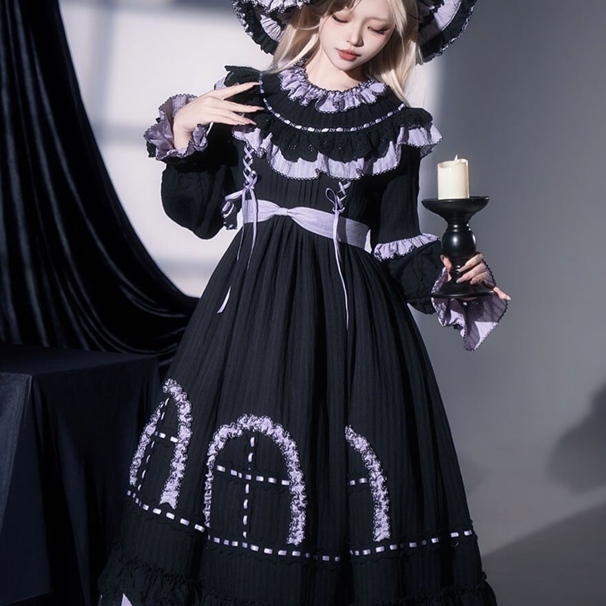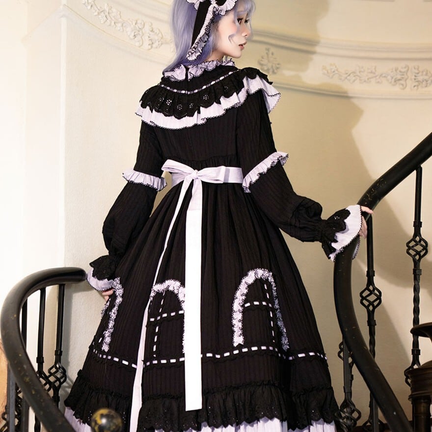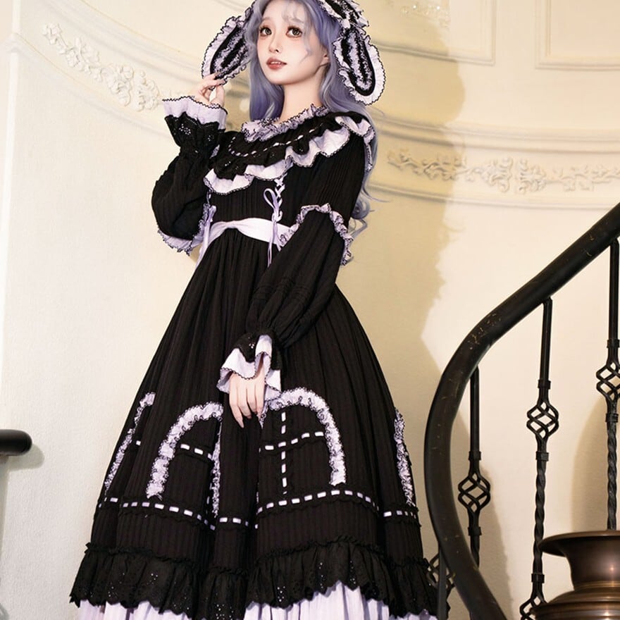 ブラックの生地に、ラベンダーとオフホワイトの繊細なレースが襟元、袖、裾にあしらわれた、クラシカルロリータのワンピースです。