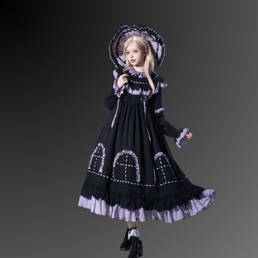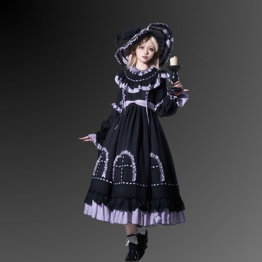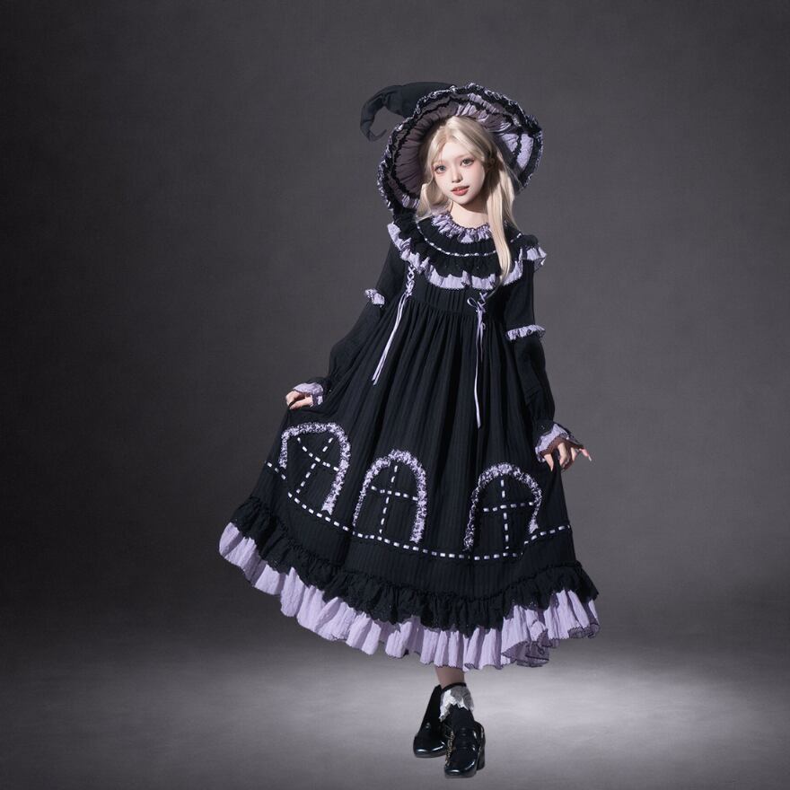 クロスモチーフやフリルの装飾が施されたデザインは、幻想的でゴシックな雰囲気を演出します。