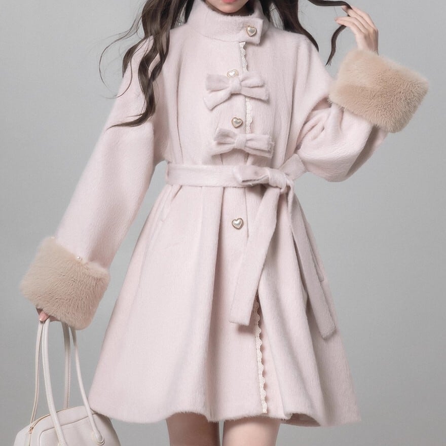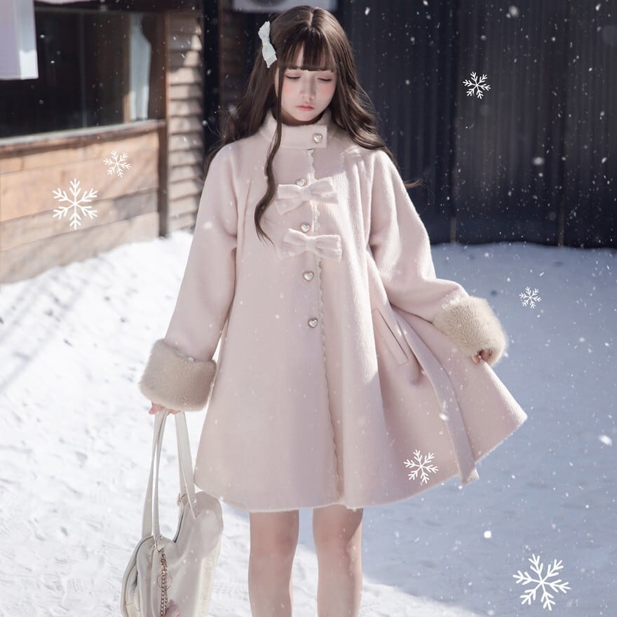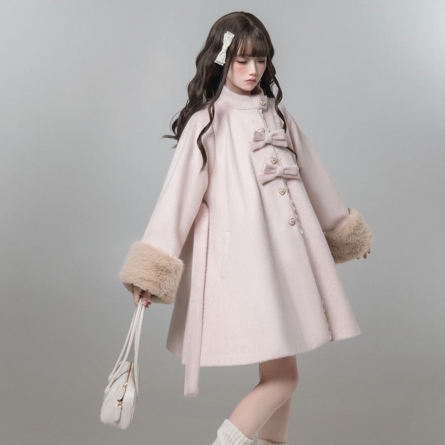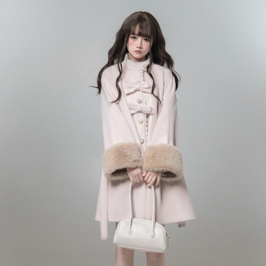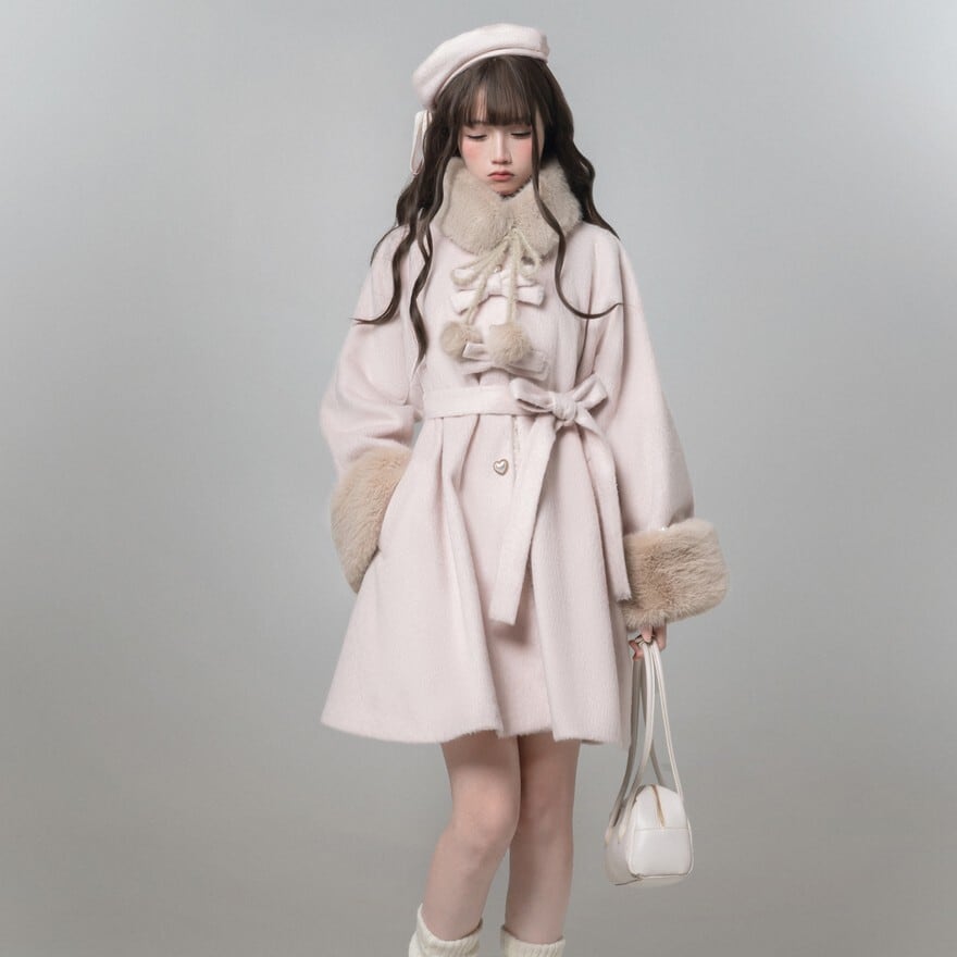 淡いピンクの生地に、ベージュのフェイクファーが袖口にあしらわれた、クラシカルロリータのコートです。
