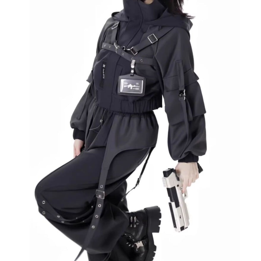 胸元のパッチやハーネス風のディテールが、近未来的でタクティカルな印象を与えつつ、シルエットはコンパクトで上品。