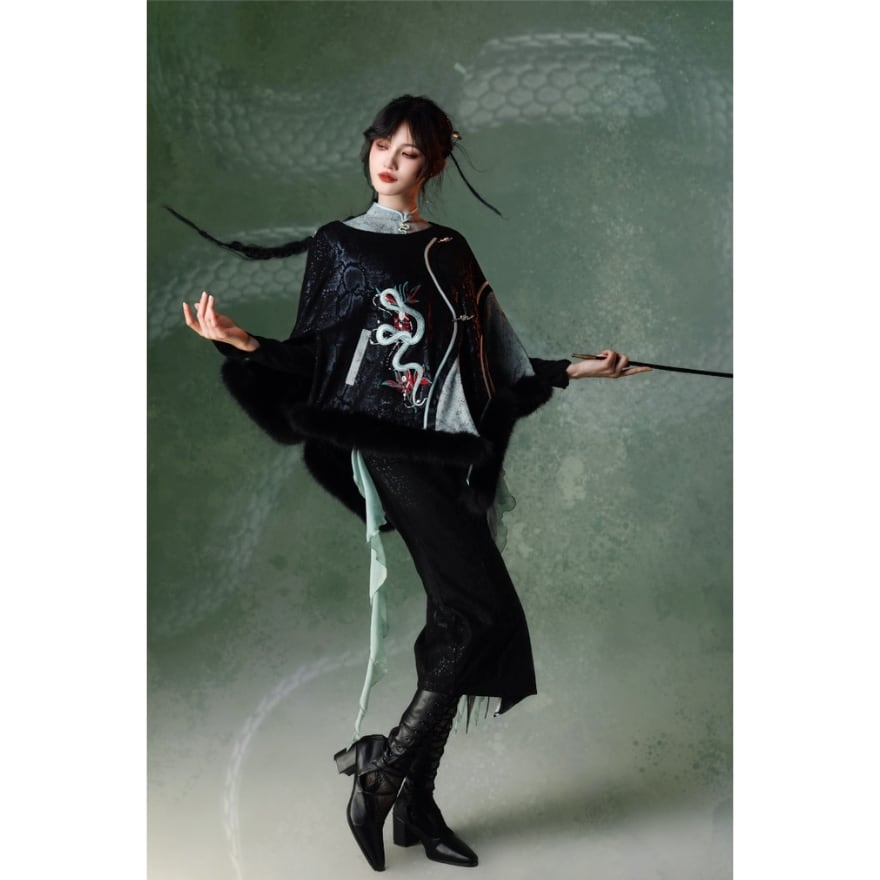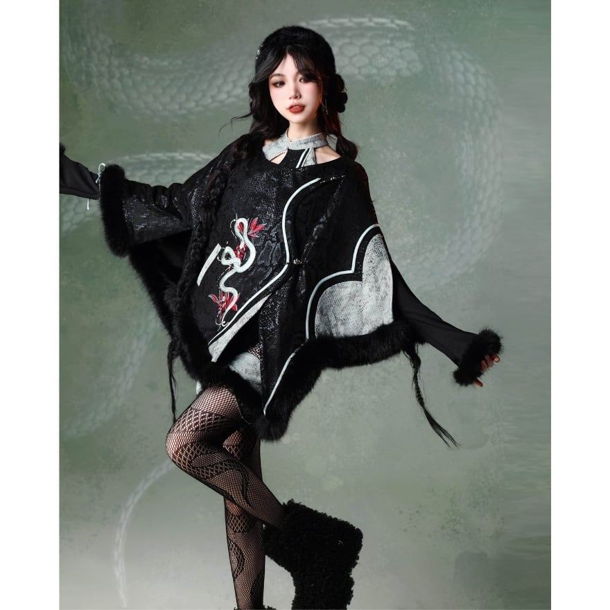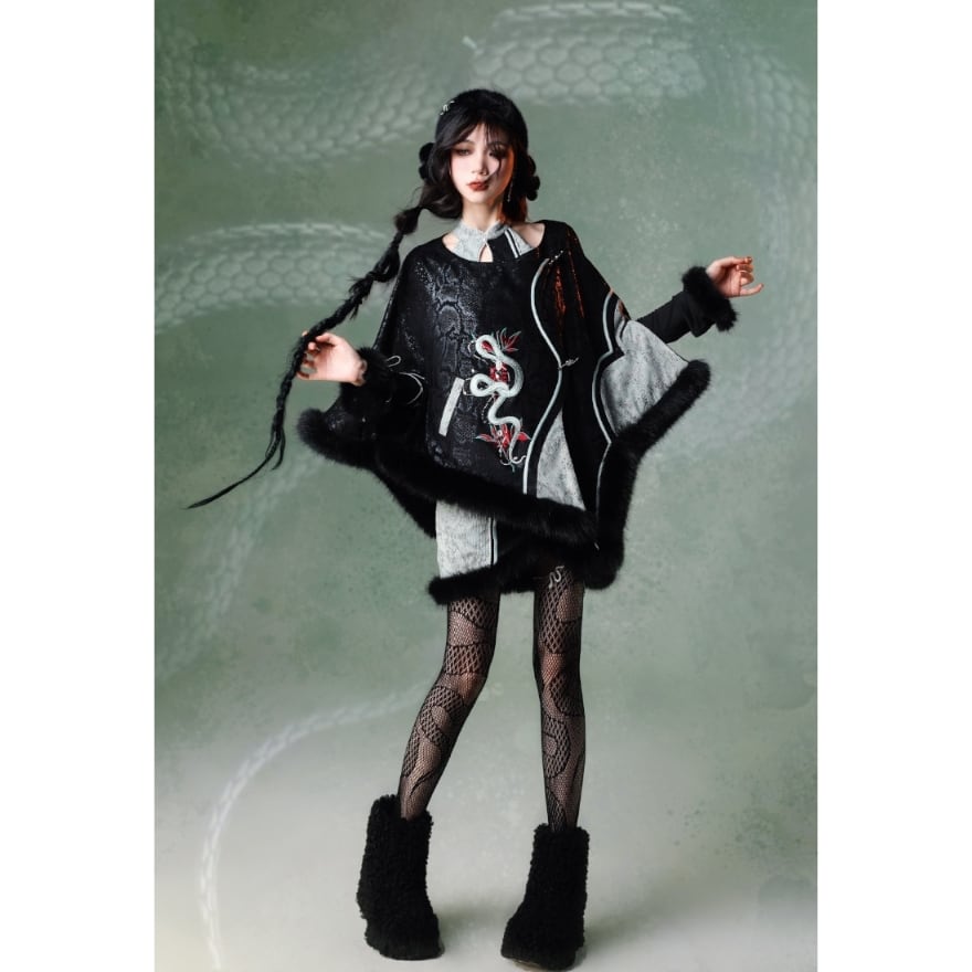 蛇モチーフ刺繍 中華ゴシックロリィタ ケープコート|ファー付き・チャイナロリィタ