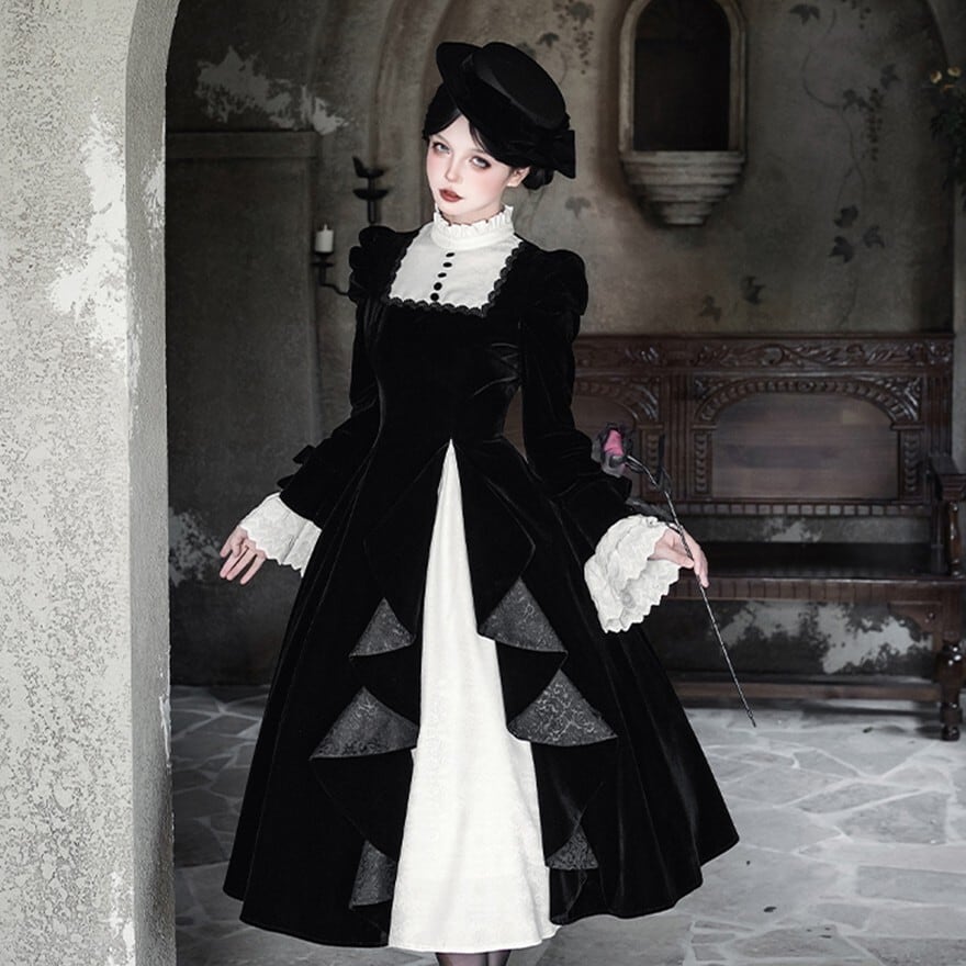 ブラックのロングワンピースは、ホワイトのパネルと三角モチーフが印象的なデザイン。袖口にはラッフルが施され、クラシカルな雰囲気を演出します。
