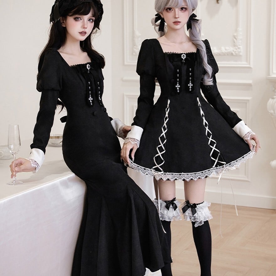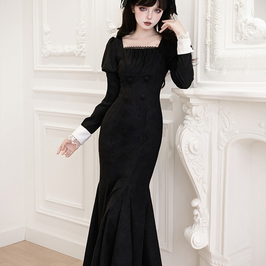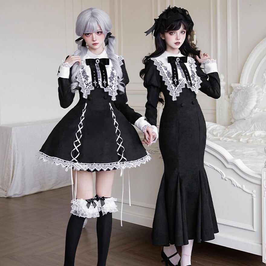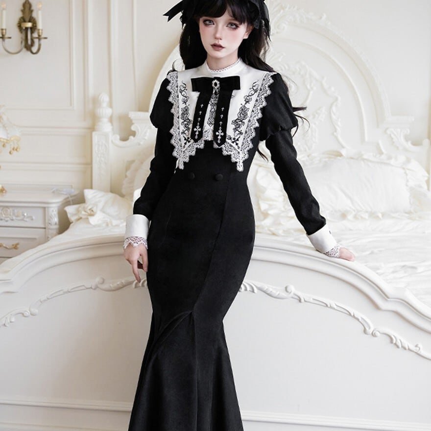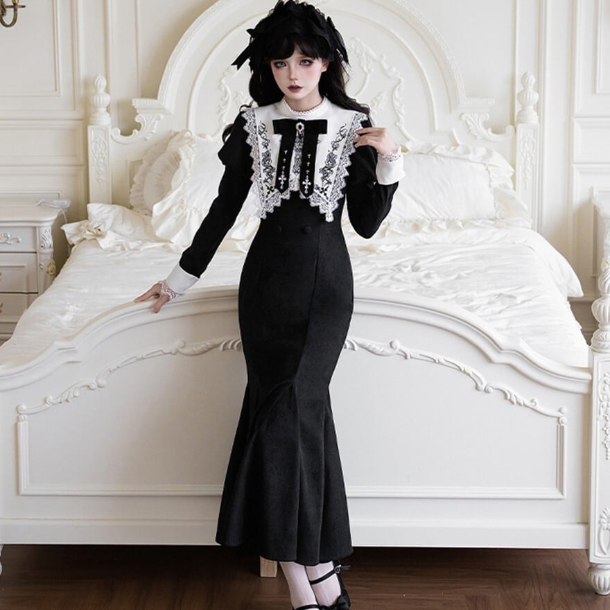 ブラックのマーメイドシルエットスカートに、オフホワイトの繊細なレースが胸元と袖口にあしらわれた、クラシカルロリータの三点セットワンピースです。