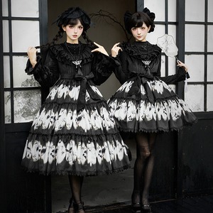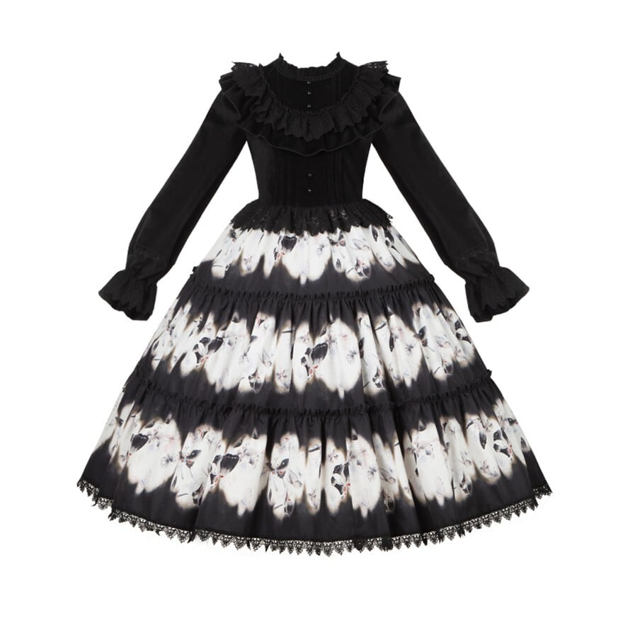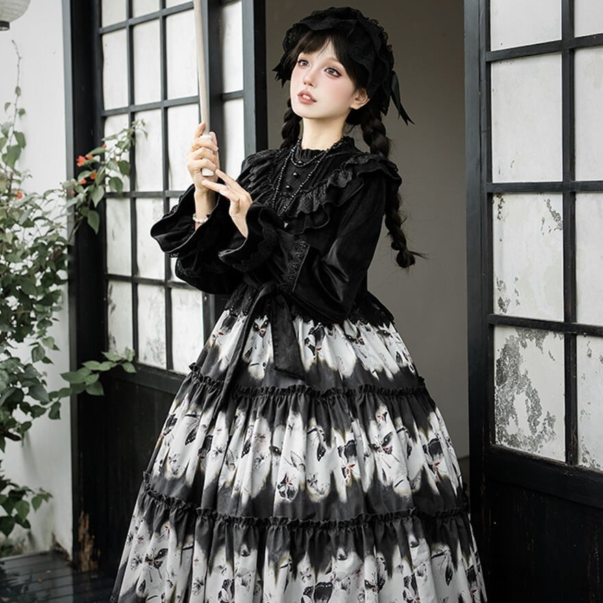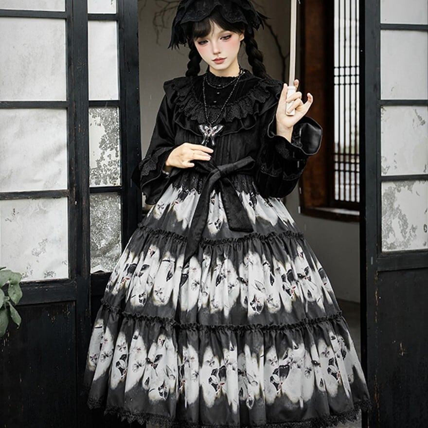 ブラックの生地に、白と黒の蝶柄があしらわれた、クラシカルロリータのワンピースです。