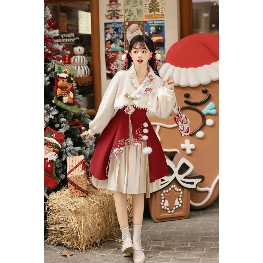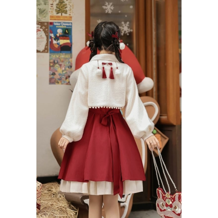 ふんわりとした質感の**上衣(ショート丈ボレロ)**に、