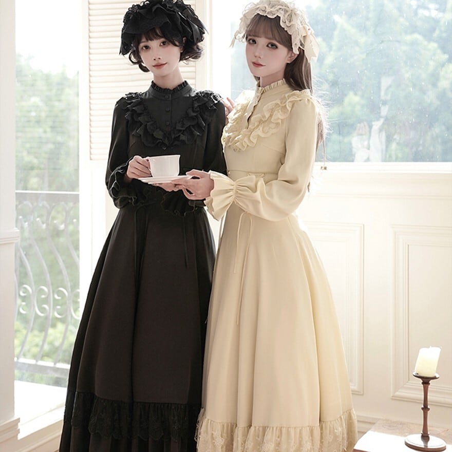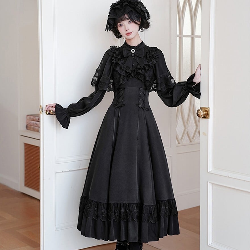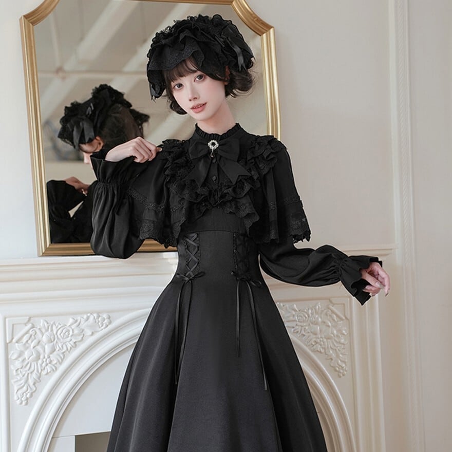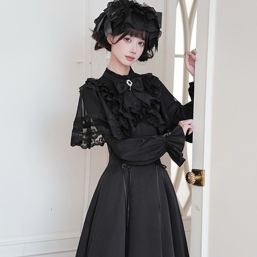 ブラックの生地に、繊細なレースとリボンが映えるクラシカルロリータのワンピースは、シックでエレガントな印象を与えます。高めのネックラインと長袖、フレアスカートがドーリーなシルエットを演出。