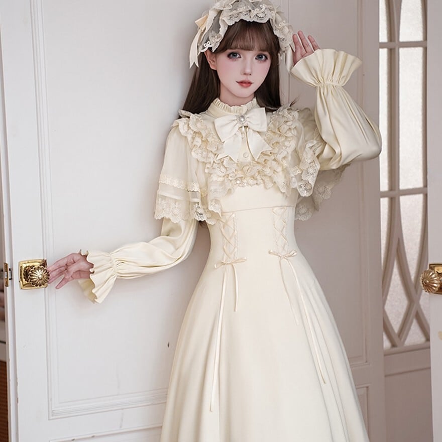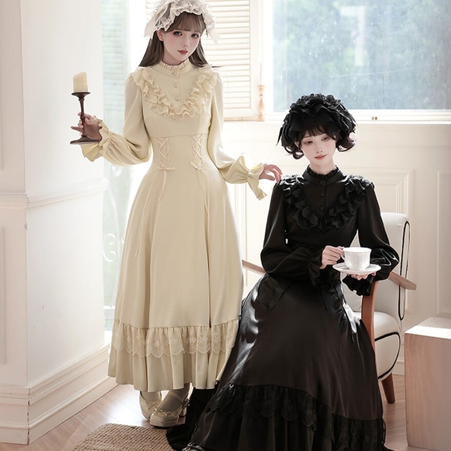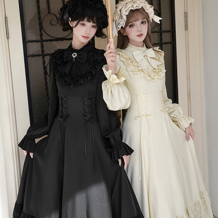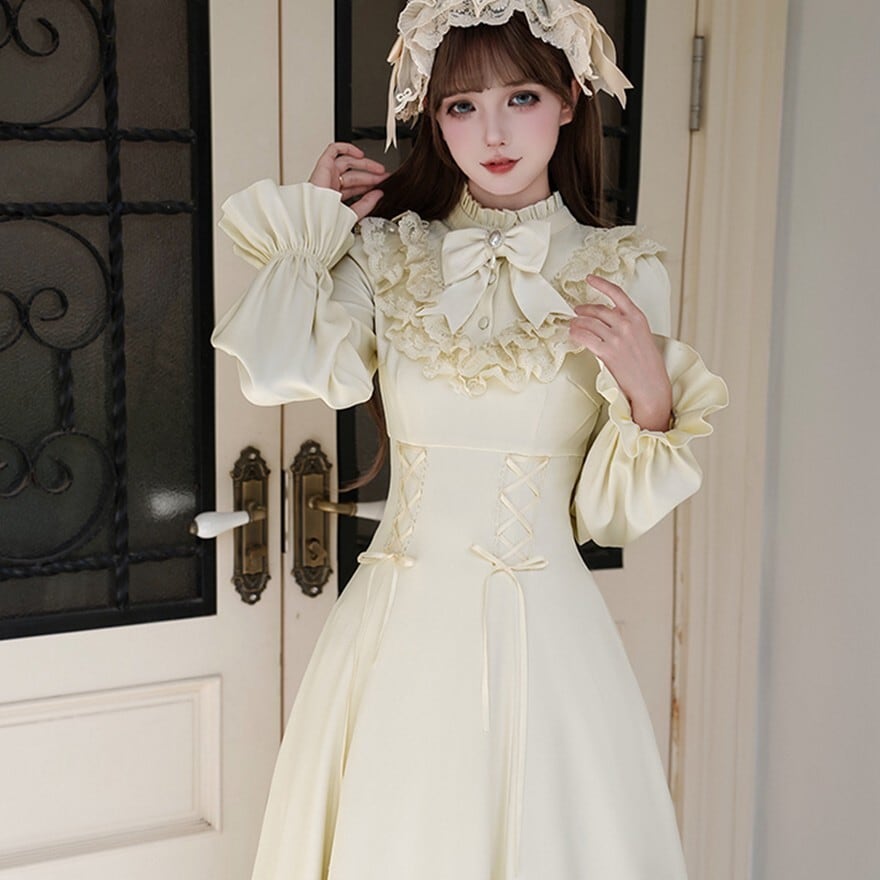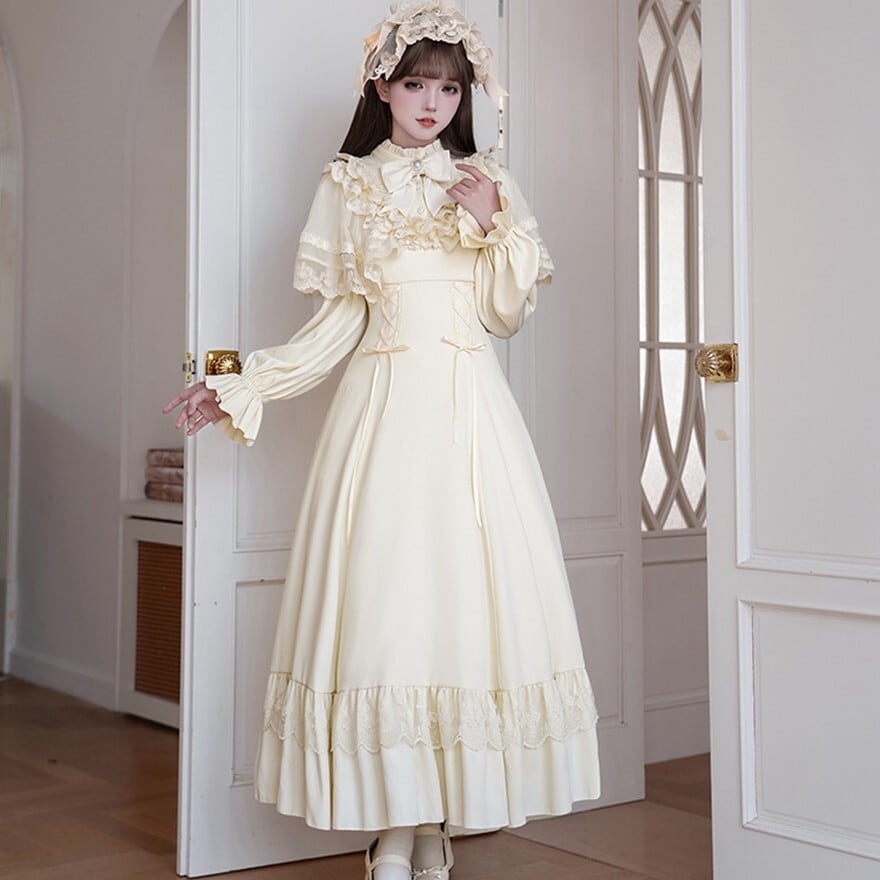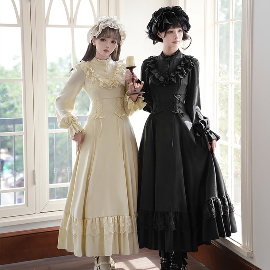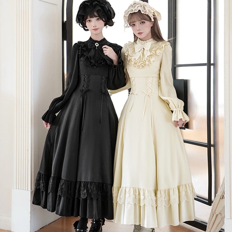 一方、生成色のワンピースは、柔らかな色合いにレースの装飾が施され、優雅でクラシカルな雰囲気を醸し出します。コルセット風の編み上げデザインがウエストを美しく引き立て、気品あるスタイルに。