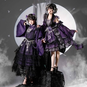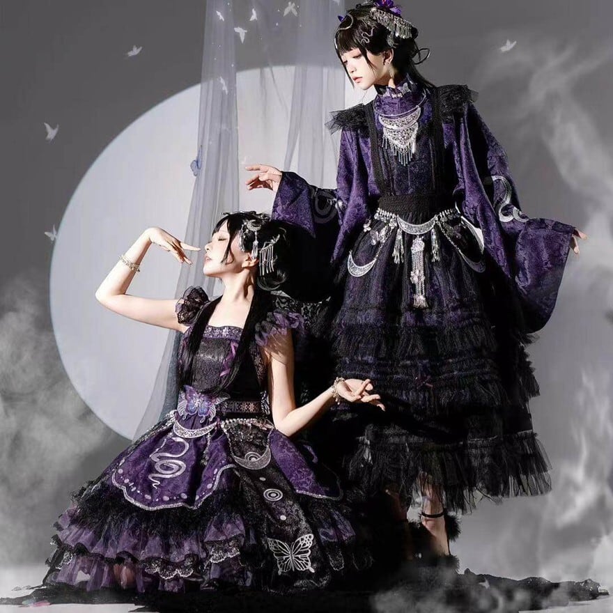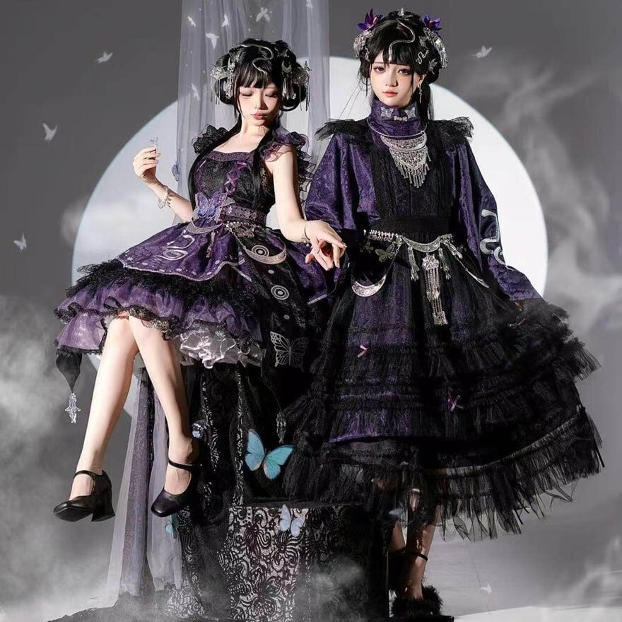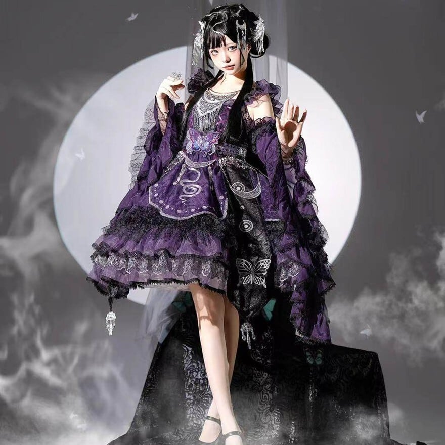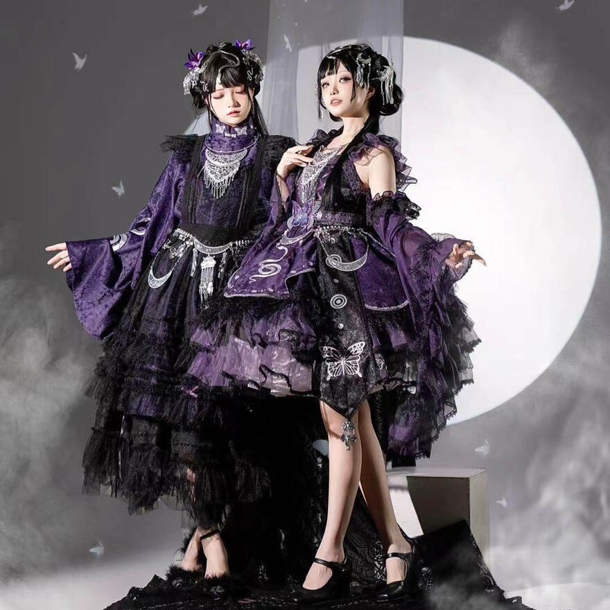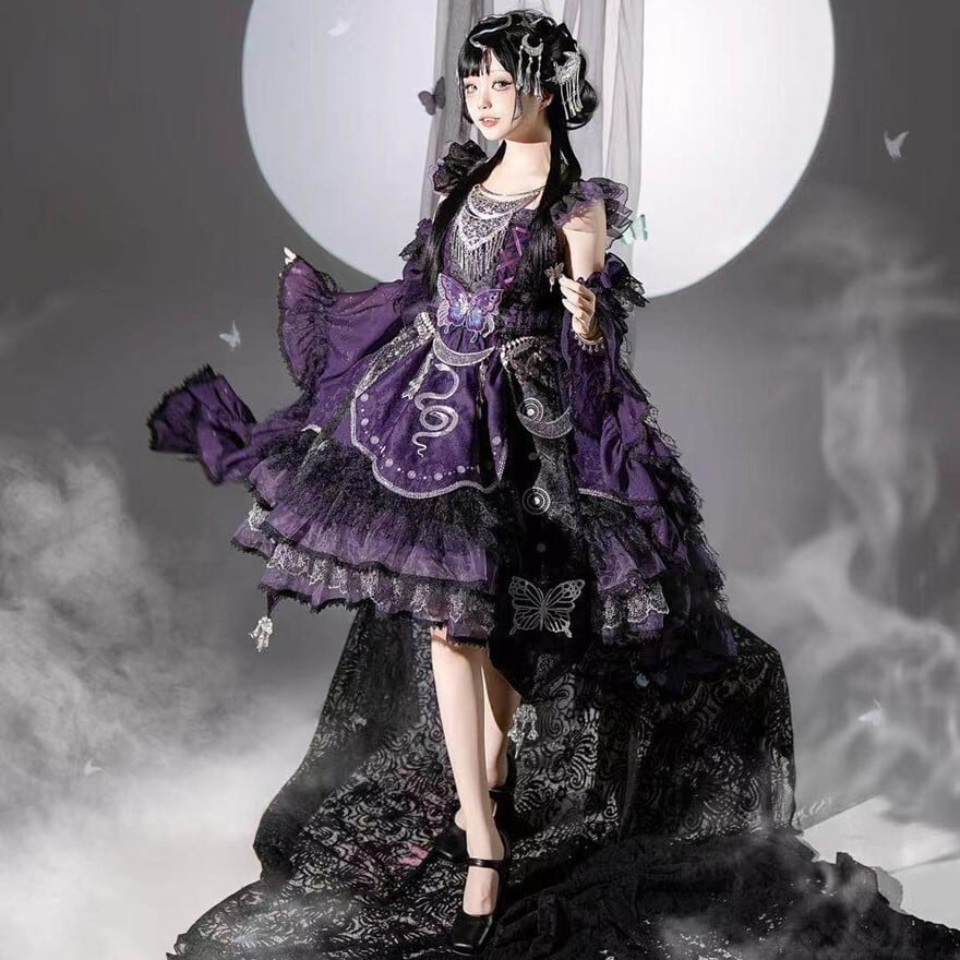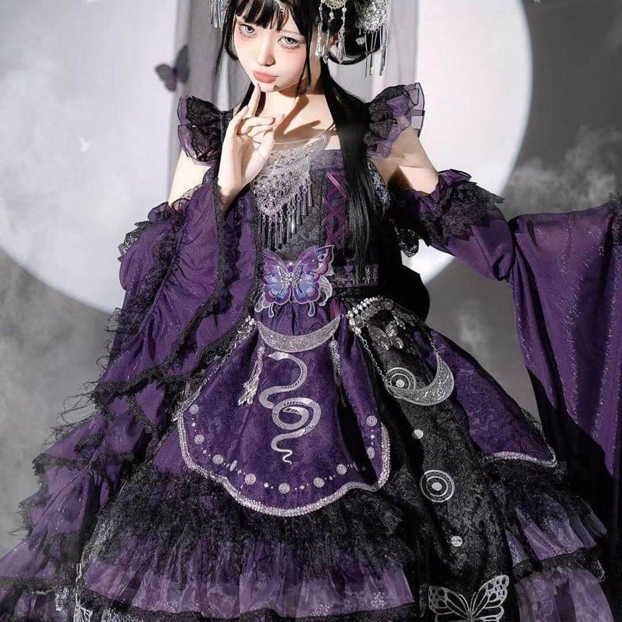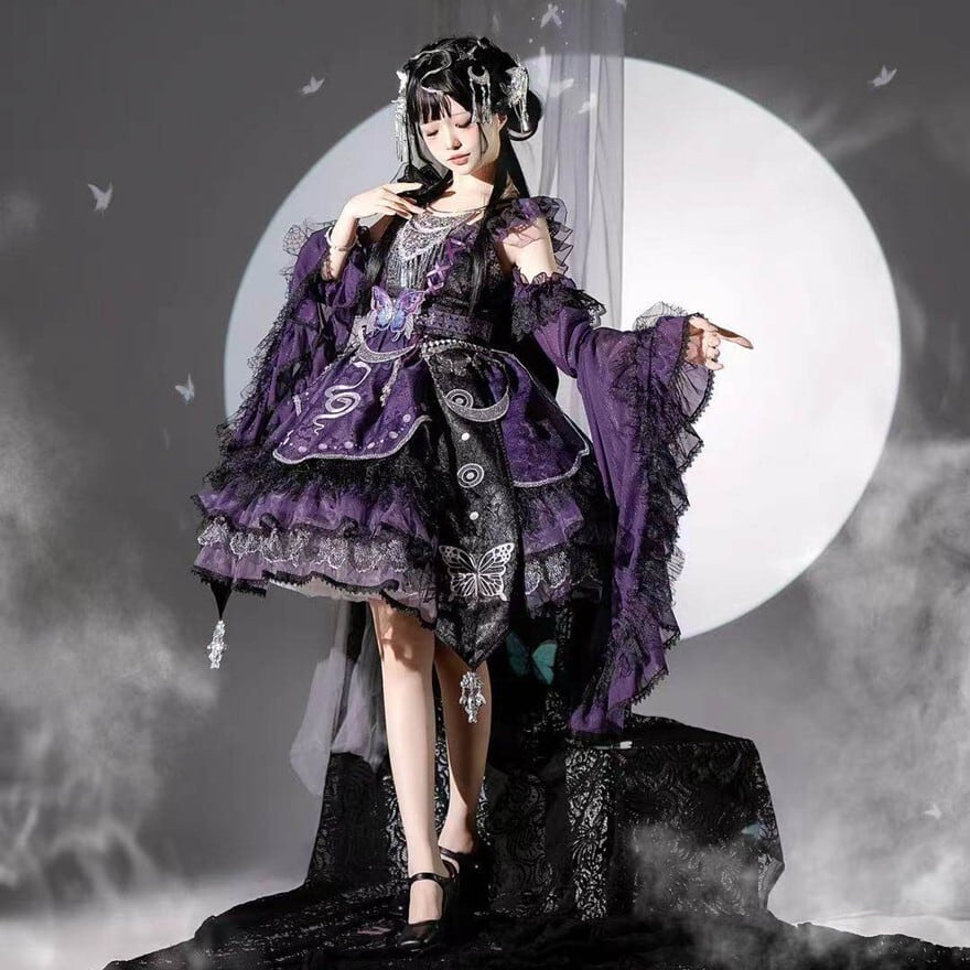 ブラックとパープルを基調とした生地に、繊細なレースや蝶のモチーフがあしらわれた、幻想的なクラシカルロリータのワンピースです。