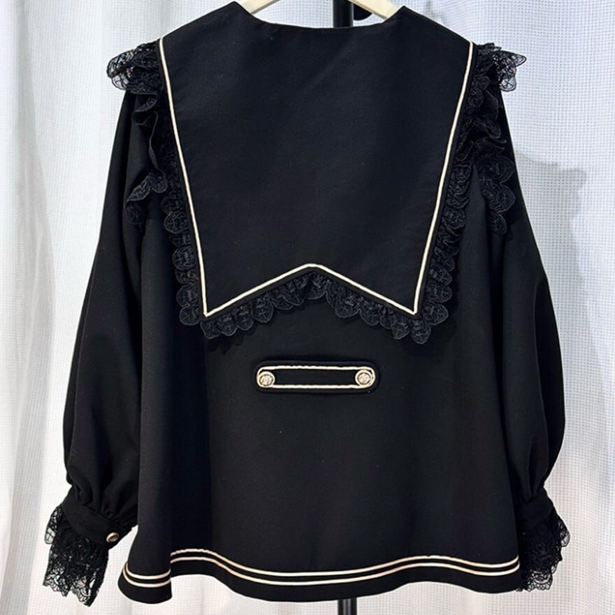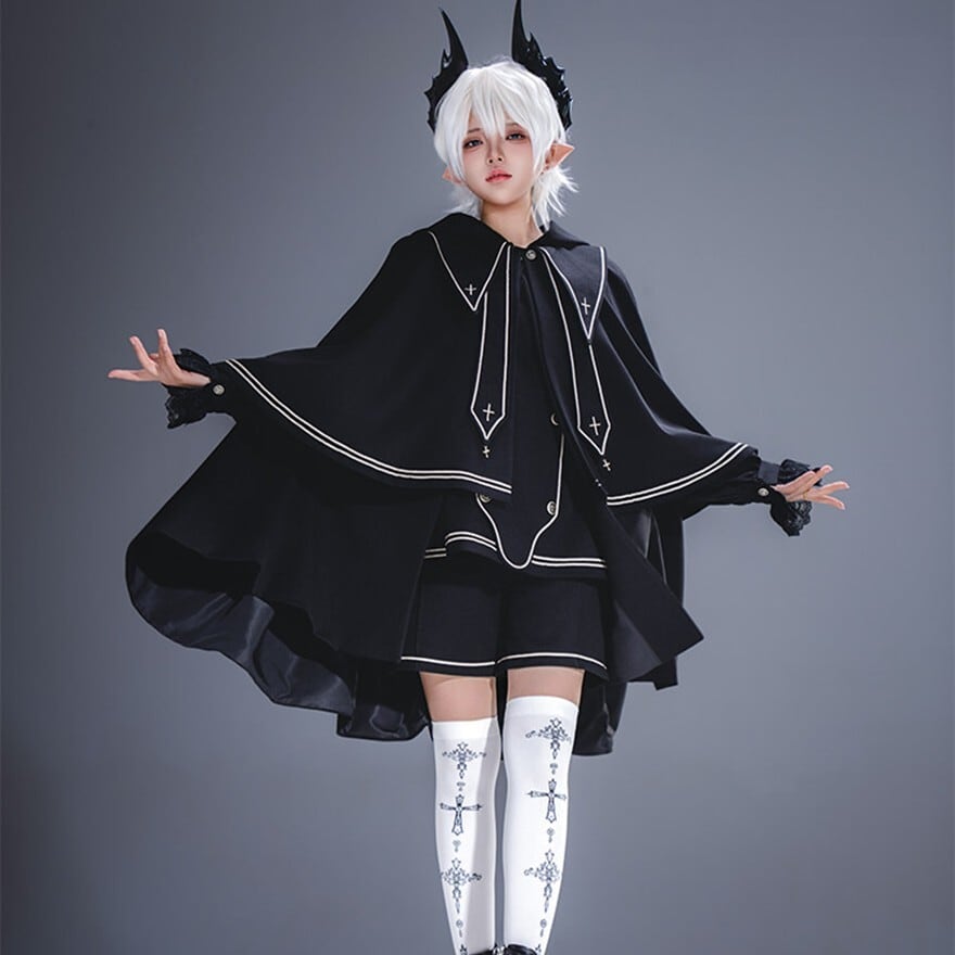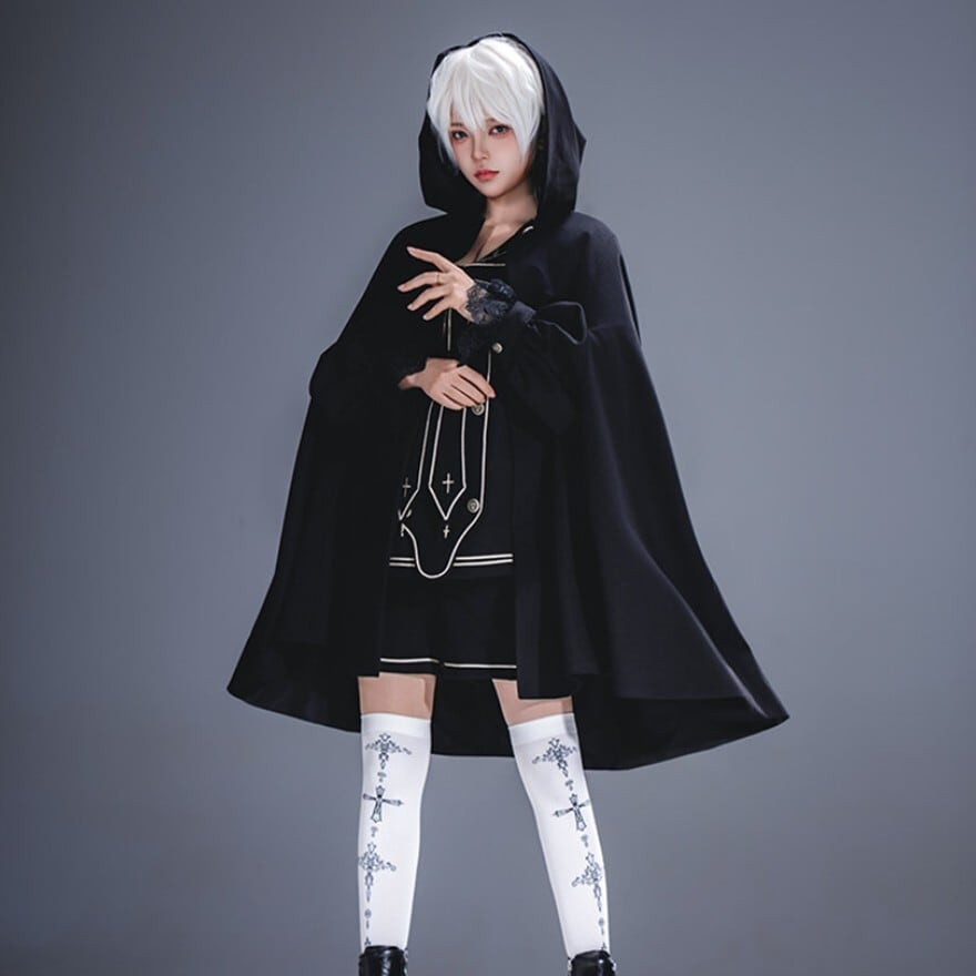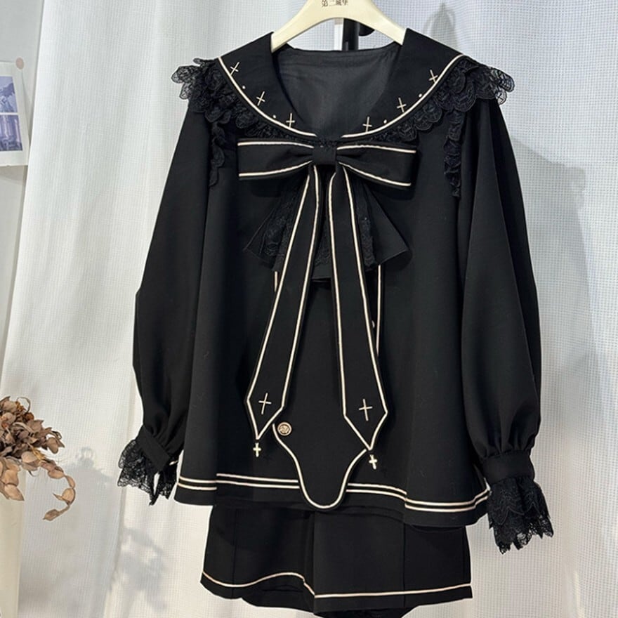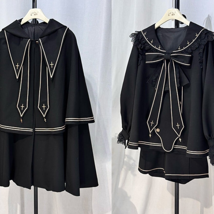 セーラー襟と十字架の刺繍が印象的なセットアップは、クラシカルでありながらも個性的なロリータスタイルを楽しめます。