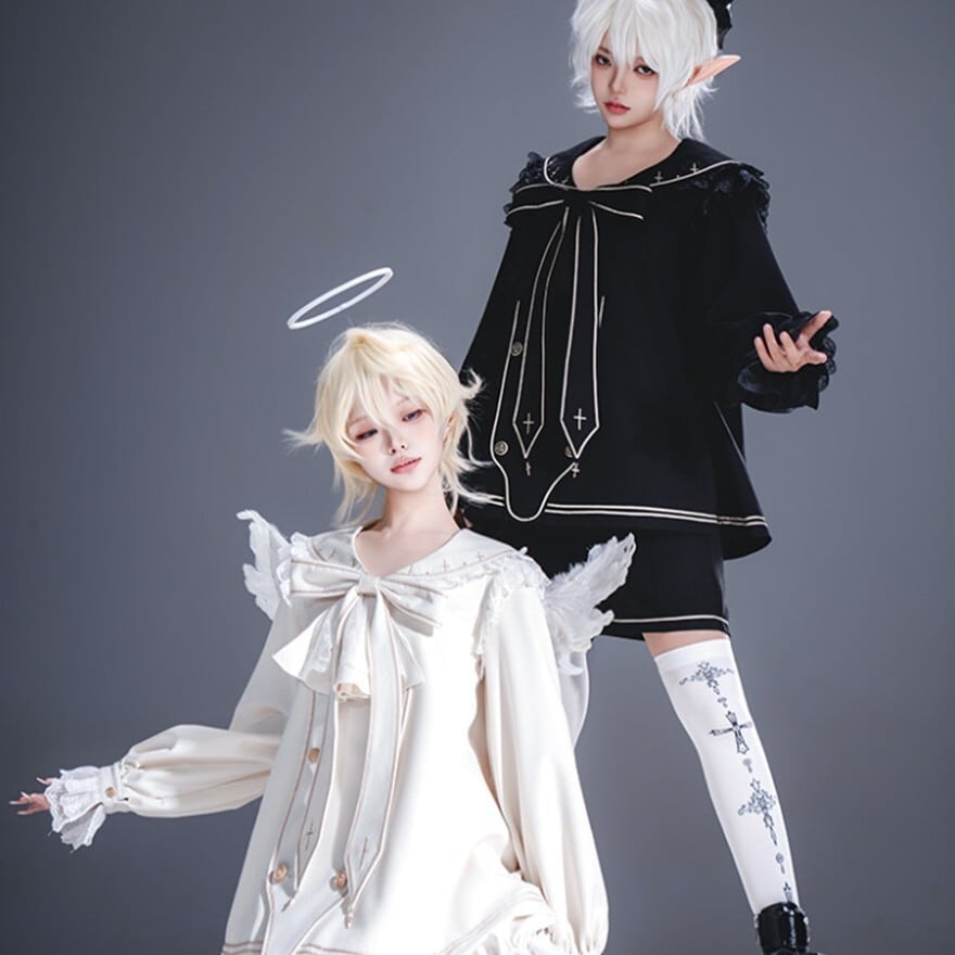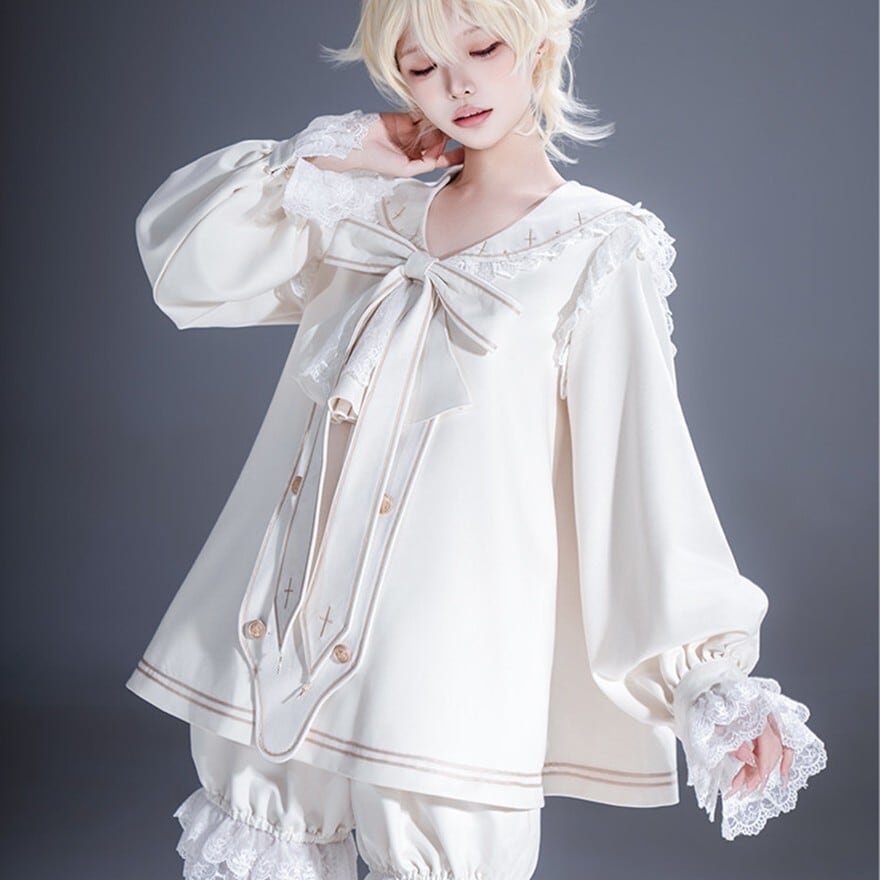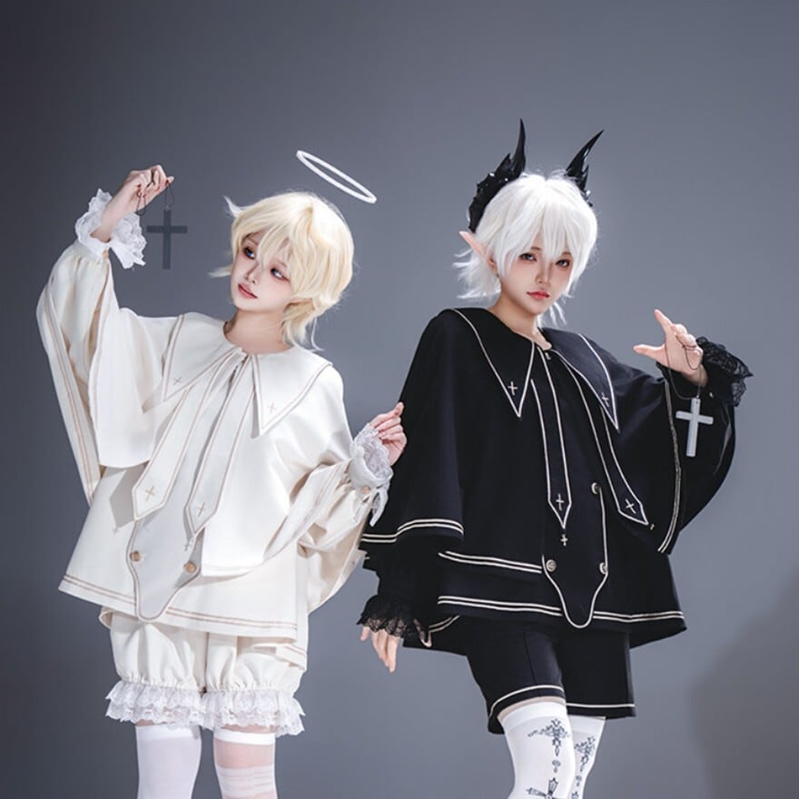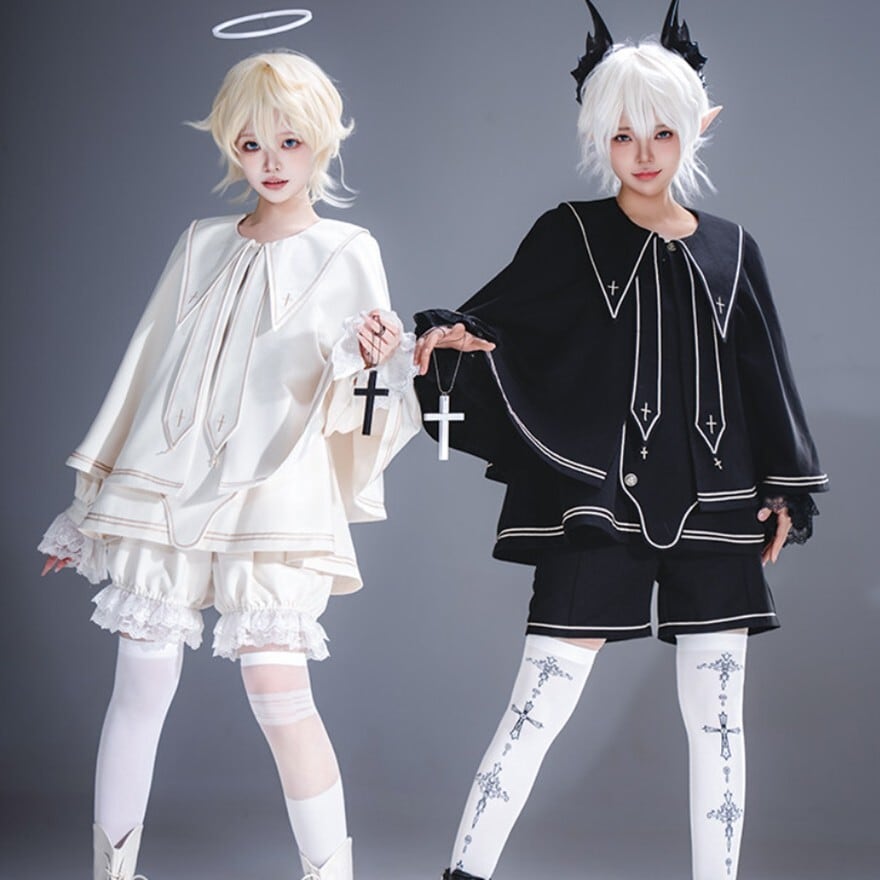 ブラックまたはホワイトの生地に、繊細なレースと十字モチーフが施された、クラシカルロリータの上衣+ズボン+ネッカチーフ+リボンの4点セットです。